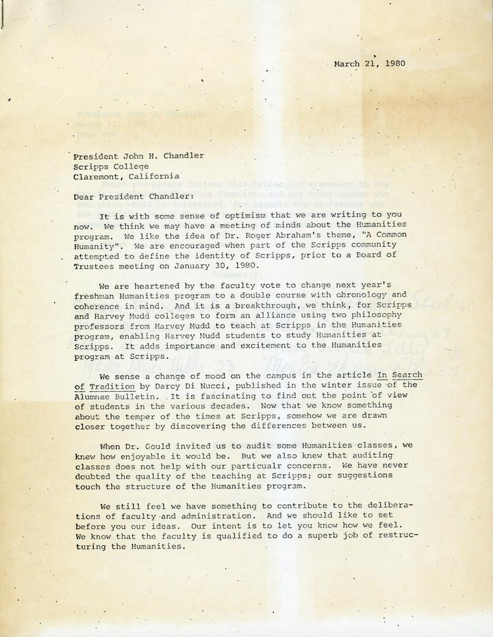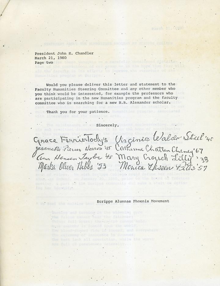 This joint letter was written in 1980, and signed by all 8 members of the Phoenix movement. It is one of the later letters written, and the tone of the letter is different from the previous ones. It is optimistic about where the humanities program will be heading, and gives us the insight that the college picked "a double course with chronology and coherence in mind" as they had so desired.