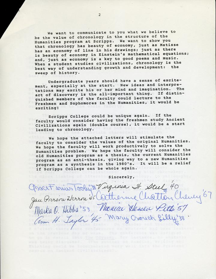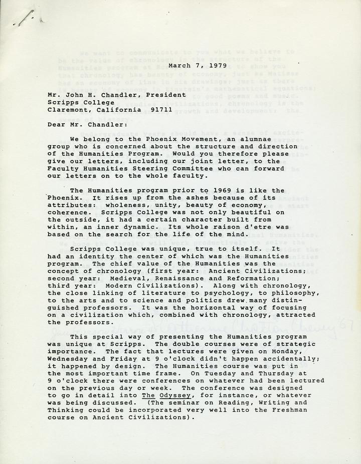 This letter was written in 1979 to Scripps College President John H. Chandler, and signed by 8 Scripps alumnae. Enclosed with it were personal letters from each alum concerning the changes in the Humanities program. A couple of news articles sited by the letters as well as a letter from Virginia Waldo Steele to Grace Ferrier Tooby were included. That letter gives insight into how the alumnae were brought together and the Phoenix Movement formed.