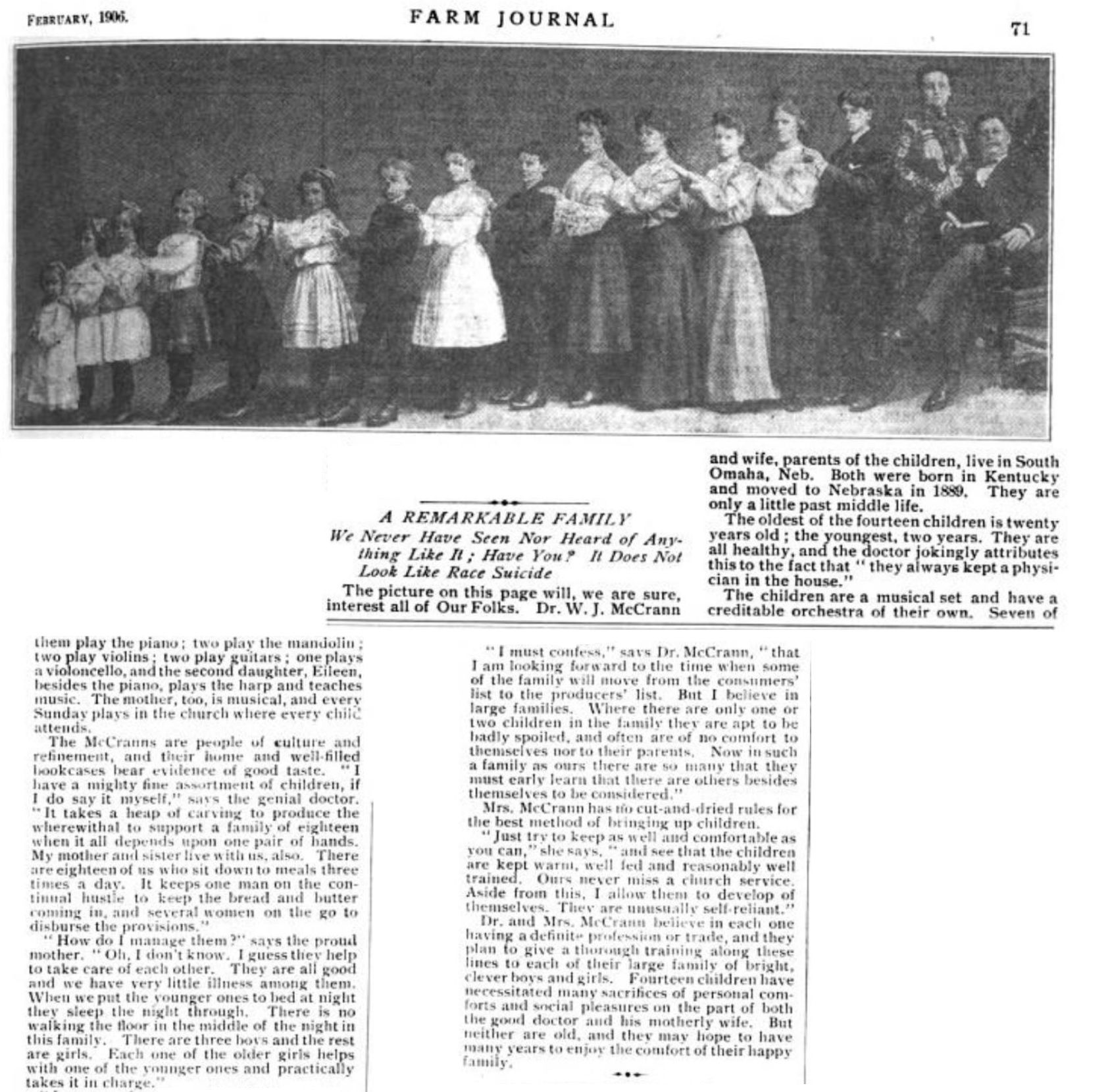 Biography: Dr. William Joseph McCrann (1855-1933) was born March 31, 1855 in Louisville, Kentucky. His Father, John McCrann, was born in county Sligo, Ireland in 1830, emigrated to America in 1851, moved to Louisville where he was married in 1853, and died an untimely death in 1860. William Joseph McCrann graduated with honors and a gold medal from the Louisville Medical College. After moving to Nebraska, he was a physician in Tecumseh and Omaha for most of his career, with a specialization in treating children and women. Married to Mary C. T. (Hannon) McCrann, an organist and choir director, the couple had 14 children (see below). McCrann was very active in civic life in Omaha, and was a member of the Omaha Douglas County Medical Society, the Knights of Columbus, the Ancient Order of Hibernians, the Democratic Party, the Ancient Order of United Workmen, and the South Omaha Commercial Club - for which he served as president for 8 years. He also acted as a physician for Catholic charitable organizations in Omaha and South Omaha, as well as for several fraternal orders and insurance companies. He helped to establish St. Catherine Hospital, where he worked for many years. He also led a group that proposed a new use for stockyard refuse - as an alternate fuel source they called "American Peat". Dr. McCrann died on October 13, 1933 in Papillion, Nebraska and was buried in Holy Sepulchre Cemetery in Omaha. For a full obituary, please click here and here.