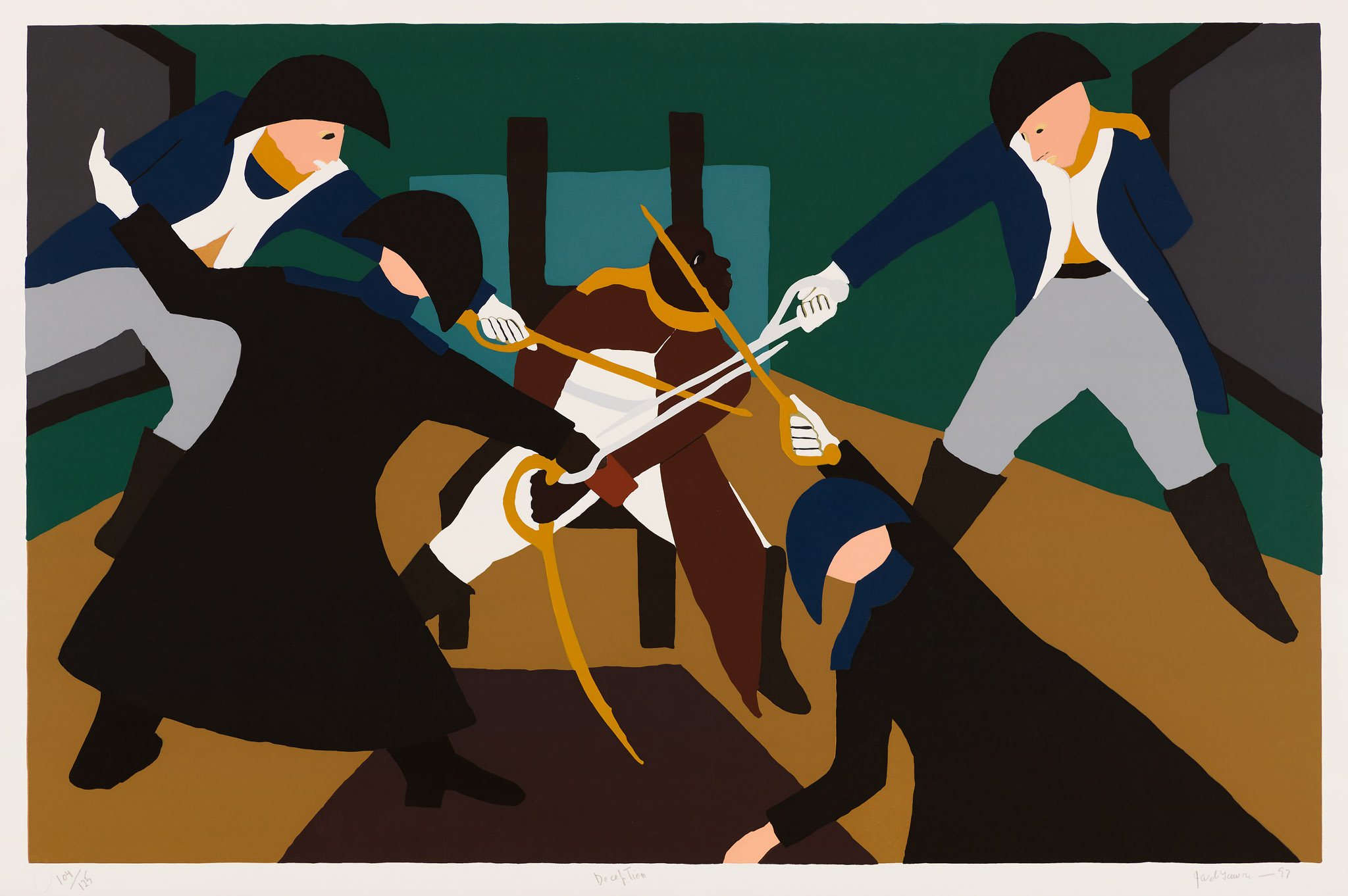 Tied down to a chair, Toussaint L’Ouverture is threatened by four French soldiers. Deception is one of the few prints of the revised series to directly show interactions between the Haitian revolutionaries and their White colonizers. Though the Frenchmen are interrogating L'Ouverture, their blades point toward one another, making us ask who is deceiving whom? The situation may be grim, but it is only a momentary defeat for L'Ouverture.