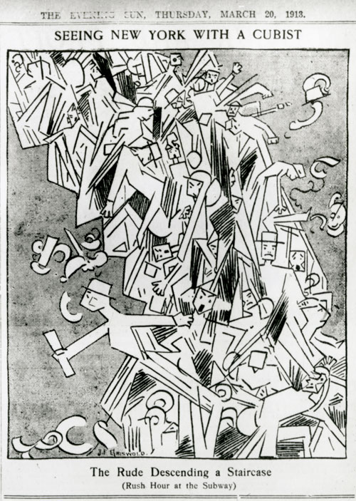 Elizabeth Lunday summarizes some of the early critiques of the 1913 New York Armory Show in her book, The Modern Art Invasion: Picasso, Duchamp, and the 1913 Armory Show That Scandalized America. - “TheSun reported, “Any fear that the weird paintings of the Post-Impressionists, Cubists, and Futurists… would not be appreciated in this country was dispelled” - “Joseph Edgar Chamberlin of the EveningMail praised the show as “getting at the vital in art” and applauded organizers’ efforts to search out distinctive voices.” - “Hutchins Hapgood at the Globe fell over himself with enthusiasm, writing that at the show “the skyscrapers of prejudice were shaken and the static buildings of outwork tradition were set on fire” (Lunday 63 CHECK CITATION) However, most of the later responses to the Armory Show would heavily critique the choices of the Armory Show organizers and the European avant-garde that was displayed in the exhibition, especially the Chicagoans that wrote about the show. “While the Journal-American marveled the show “is making its presence felt in a way that probably no previous exhibition in the country has ever done,” the Evening World proclaimed, “No Imagination Outside the Psychopathic Ward of Bellevue or the Confines of Matteawan [State Hospital for the Criminally Insane] Can Conceive Without Actually Seeing It What a Cubist Picture Is Like” (Lunday 63) In Chicago, the headlines about the Armory Show demonstrated mass outrage and disgust towards developing modern art trends. Highlights include: - “Big Crowd Expected At Freak Art Exhibit” The Chicago Evening Post, Wednesday March 19th, 1913. - “Futurist Paint Puzzles Arrive: Look Like a State of Mind” Chicago Examiner, Wednesday March 19th, 1913. - “Hark! Hark! The Critics Bark! The CUBISTS Are Coming To Town With CUBIST Hags and CUBIST Nags And Even A Cubist Gown” The Sunday Record-Herald, Sunday March 23rd, 1913. - “Weird Art Is Shown” The Daily News, Monday March 24th, 1913. - “Cubist Art Severs Friendships - Institute Directors Are Divided” The Inter Ocean, Friday March 28th, 1913. - “What’s a Cubist Or a Futurist? Just a Shudder!” Record Herald, Tuesday April 1st, 1913. - “President Wilson A Cubist? Sure! Art Collector Says” The Chicago Daily Tribune, Friday April 4th, 1913. - “Cubist Art Ruffles Up Tempers Of Society Folk at Flower Show” The Sunday Record-Herald, Sunday April 6th, 1913. - “Art Institute Grilled By Pastor For Cubist Show” Chicago Daily Journal, Monday April 7th, 1913. - “Creator of ‘Futurist Art’ Admits It’s Fake” Chicago Daily Journal, Tuesday April 8th , 1913. The press-coverage of the Chicago Armory Show ended in a blaze of glory on Monday, April 16th when a group of students from the Art Institute of Chicago revolted and burned copies of Cubist paintings in the street. Headlines such as, “Students Burning Futurist Art and Celebrating Cubist Departure” (The Chicago Daily Tribune) and “Cubist Art Exhibit Ends ‘At The Stake’” (The Chicago Record-Herald) filled Chicago newspapers. Shortly after, the Armory Show was on its way to Boston, where it would receive today’s equivalent of what our society deems a “side-eye”. Although the newspaper headlines from the Armory Show have proven to be entertaining, they didn’t even come close to the response cartoonists would provide via the daily newspapers. When the show started in New York, cartoonists had responded quickly to modern art with their opinions, personal responses, and interpretations of the show. Chicago cartoonists followed suit. You can view the most infamous cartoonist responses below(or to the left/right however it is organized) - The New Art by Mauriece Ketten - J. F. Griswold’s “The Rude Descending a Staircase (Rush Hour at the Subway)” - “The Original Cubist,” Clare Briggs (1875–1930), New York Evening Sun, April 1, 1913. - “With the Cubists and Futurists,” Puck, March 19, 1913. - “Nobody Who Has Been Drinking is Let in to See This Show.” Alek Sass, New York World, February 17, 1913. - “The Modern Art Show,” Winsor McCay, New York Herald, 1913. - “Art, Past, Present, Future,” Life, April 24, 1913. (New York Society Library) - “The ‘New Art’ Fest,” Frederick Opper (American, 1857–1937), New York American, February 27, 1913. - “How to Become a Post-Impressionist Paint Slinger,” John T. McCutcheon (American, 1870–1949), New York Evening Sun, March 6, 1913.