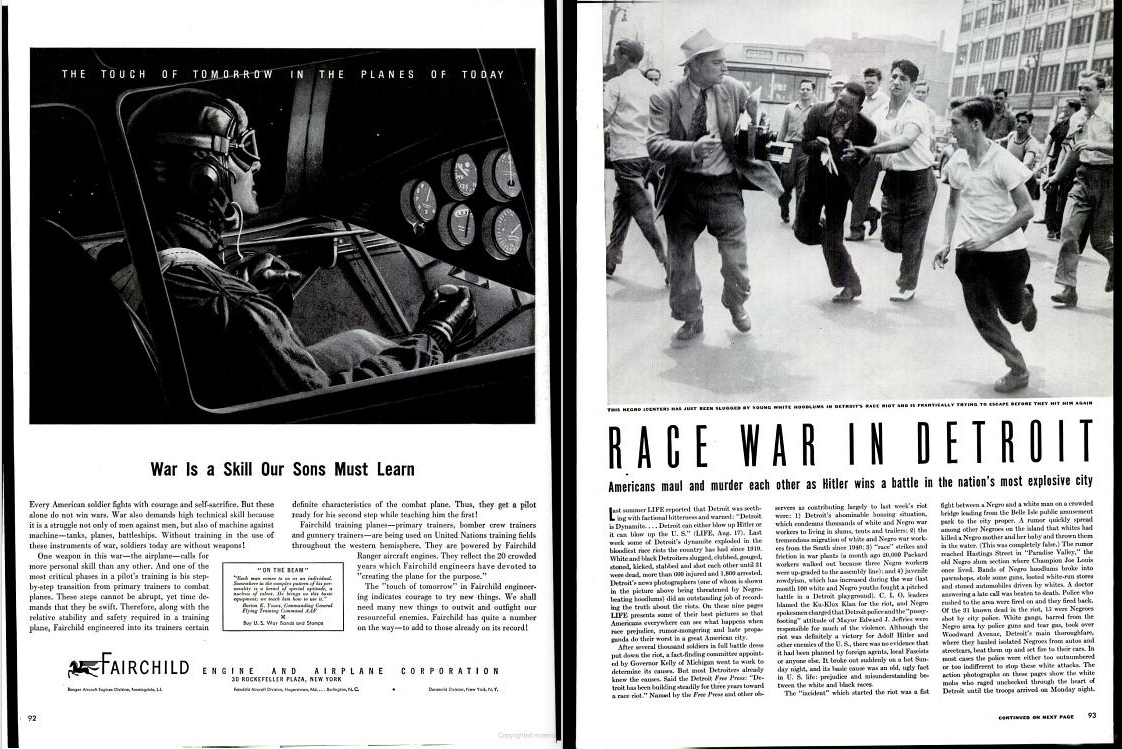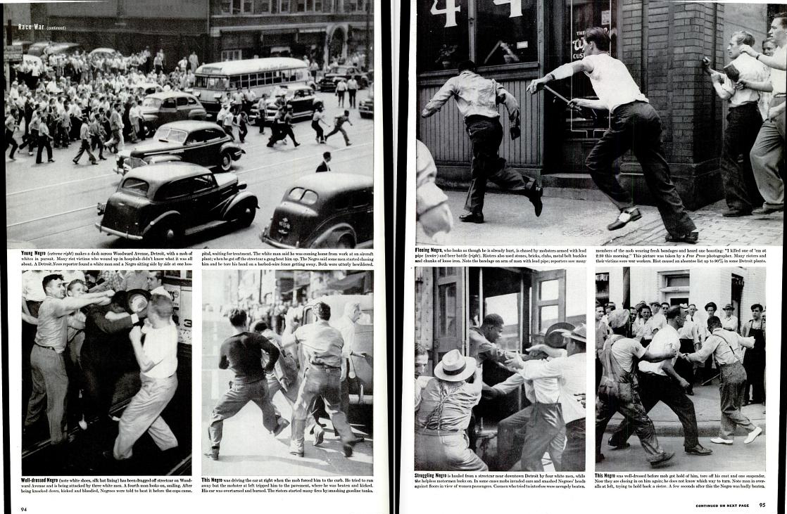 In 1943, riots were reported in several cities across the United States, from Los Angeles to Beaumont and Mobile to Detroit and Harlem, to name the largest. The Los Angeles riot is unique amongst these in that it is still remembered as the “Zoot Suit Riots," named after the clothing that allegedly incited the riot. Unsurprisingly, this evasive name has been contested, at times called the “so-called pachuco riots,” “sailor riots” and by Chester Himes at the time of the event, race riots. “Race riots” was commonly used to describe events that took place in other cities across the U.S. in 1943, but not as frequently in regards to Los Angeles. This desire to avoid discussing race and ethnicity with the Zoot Suit Riots emerged at the time from multiple causes: potential legal claims Mexican Americans have had to whiteness has historically confused clear racial identification; wartime sensitivities to an alliance between the United States and Mexico affected how Mexican Americans could be identified in the press without offending the support provided to the American war effort by Mexican nationals and Mexican American soldiers. In part, this influenced why contemporaneous news reports conjured the “zoot suit” and “pachucos” rather than focusing on the Mexican and Black Americans beaten who were not wearing the fashion, influencing even now how the riots are remembered. Memory flattens many of the socio-economic issues that influenced the riots in Detroit and Harlem, such as labor disputes in factories and the resentment resulting from discrimination against Black soldiers home from the war.