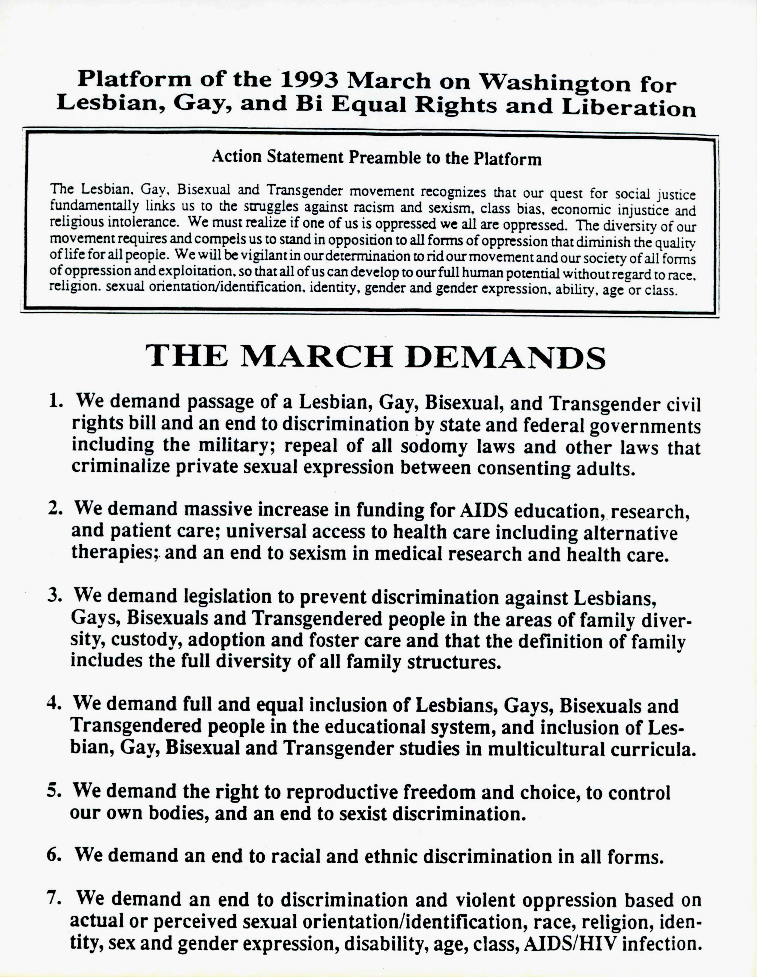 The National March on Washington for Gay, Lesbian, and Bi Equal Rights on April 25, 1993 had over 1 million in attendance. The march originally included transgender in the name of the march, but did not receive enough support in the March On Washington steering committee. Despite this, it was a turning point for transgender activism, and, “marked the greatest amount of recognition and inclusion ever accorded to the trans community by the gay, lesbian and bisexual community.”[1]