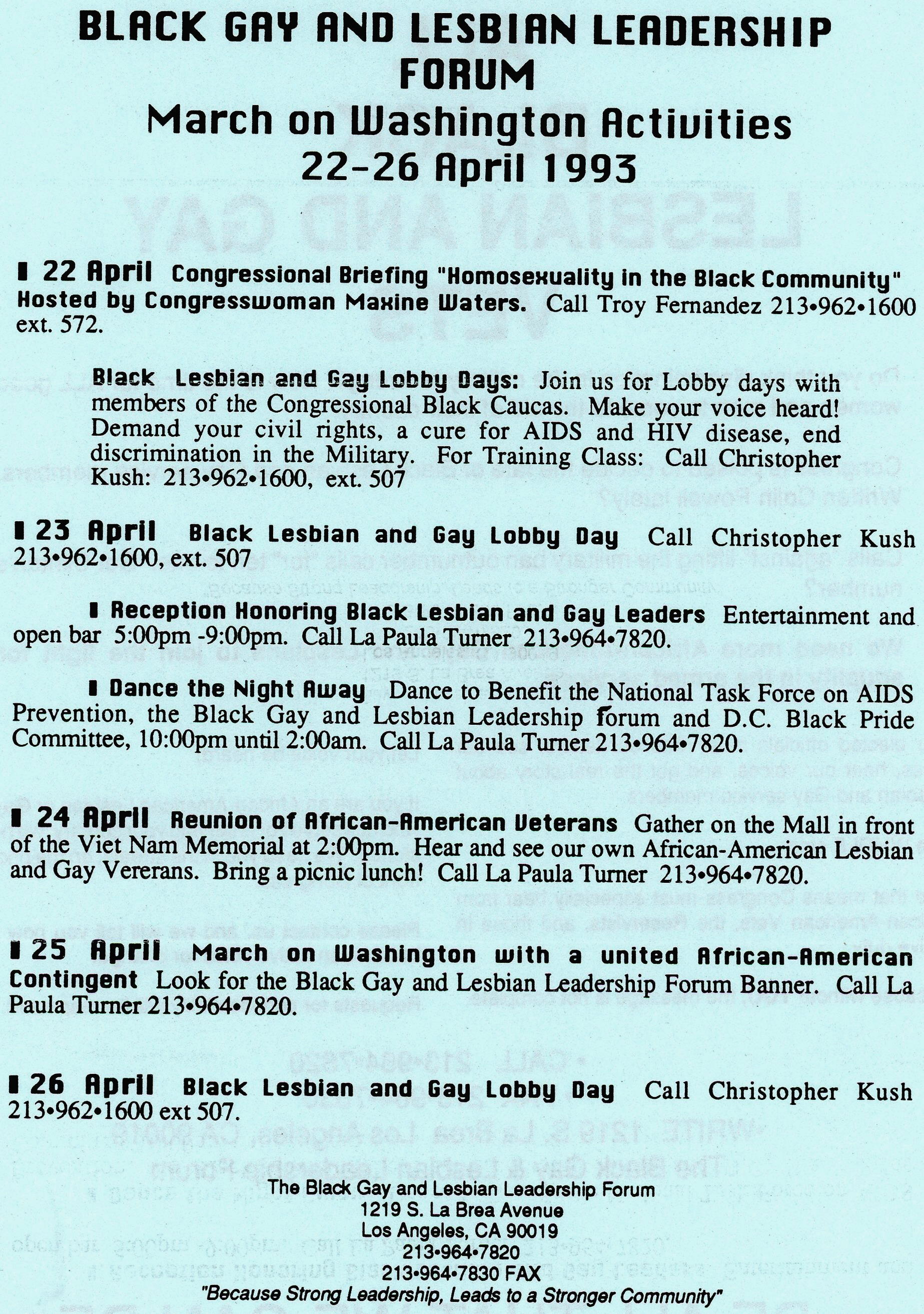 Among the queer speakers were Urvashi Vaid, Larry Kramer, Phil Wilson, Hon. Sven Robinson, Akiko Carver, Reggie Williams, Jill Lessing, Carmen Vasquez, Torie Osborn, Eric Rofes, Susan Liroff, Troix Bettencourt, joyce Hunter, Pat Ireland, Pat Hussain, Lani Ka'ahumanu, Virginia Apuzzo, Rep Gerry Studds.