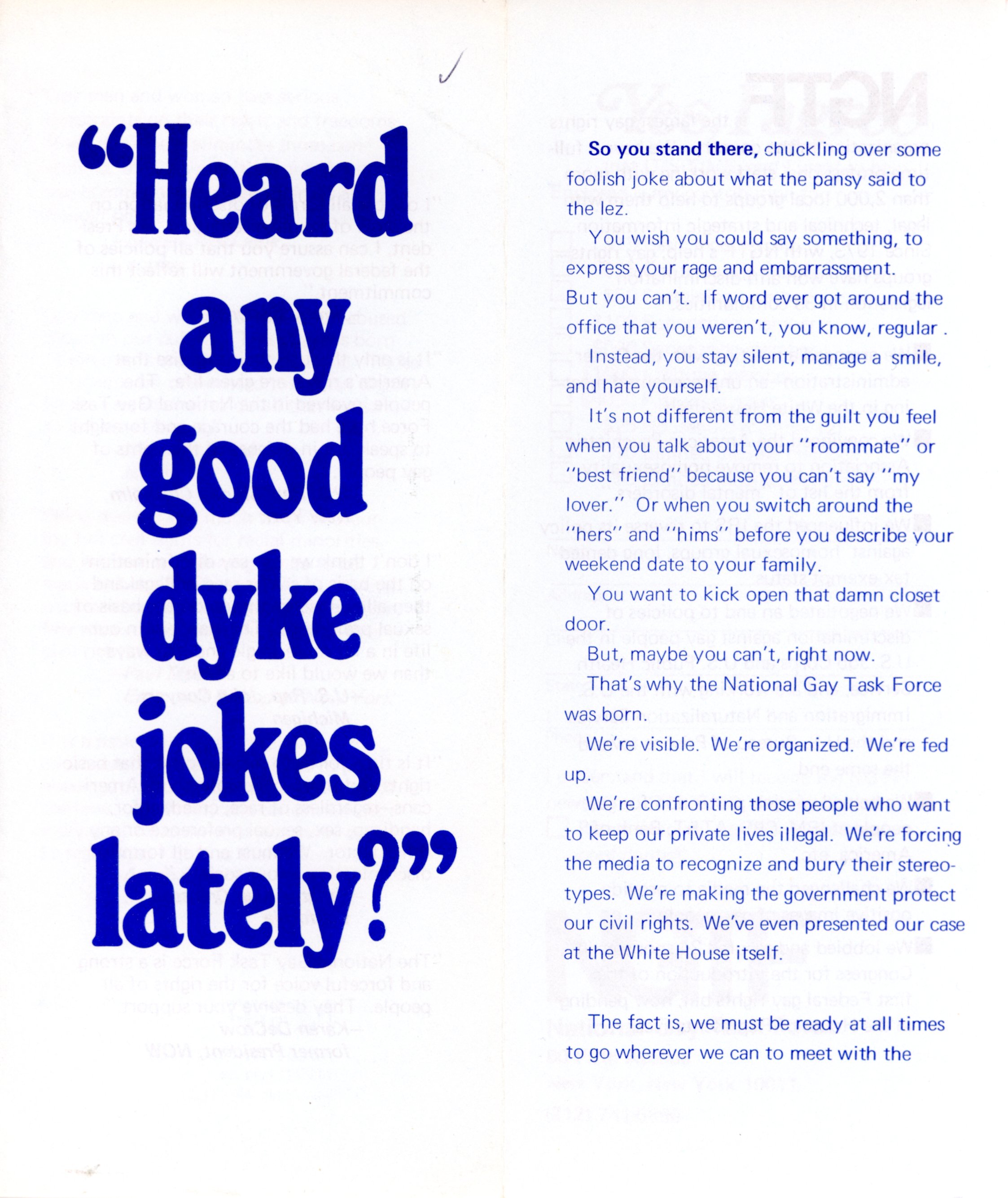 Pat Norman was the coordinator of Gay Health Services for San Francisco's Public Health Department, a founder of the Lesbian Mothers' Union and a board member of the National Gay Task Force. She spoke on internalized racism and it's role in keeping Black people from uniting. Norman concluded with a question."So, Black Lesbians, will we continue to just survive and not make progress?. . .Break the chains of internalized racism! Let's move together as Black women, Black Lesbians, becoming visible, becoming unafraid, coming together, using our differences and growing together."[4]