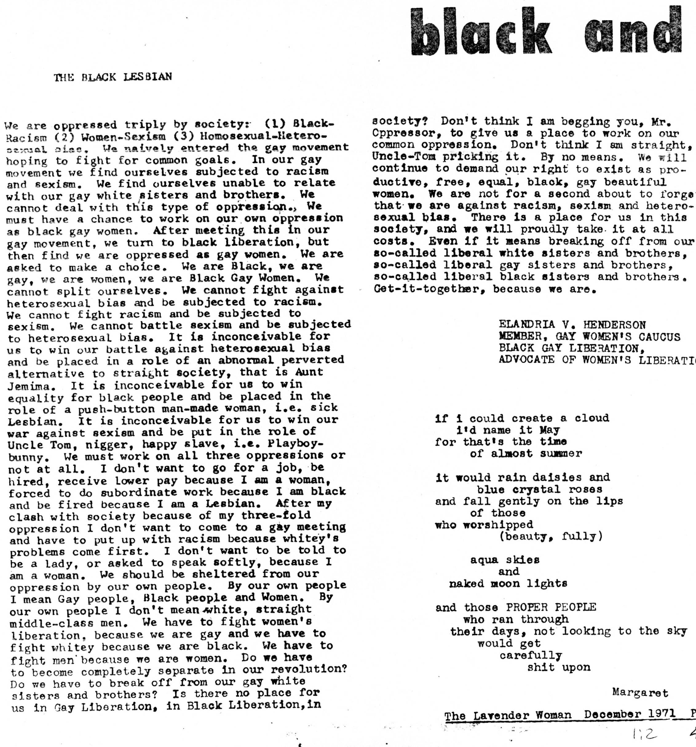 "I do not know where to begin. Long before I tried to write this realized that I was attempting something unprecedented, something dangerous, merely by writing about Black lesbian writers from any perspective at all. These things have not been done. Not by white male critics, expectedly. Not by Black male critics. Not by white women critics who think of themselves as feminists. And most crucially not by Black women critics who, although they pay the most attention to Black women writers as a group, seldom use a consistent feminist analysis or write about Black lesbian literature. All segments of the literary world-whether establishment, progressive, Black, female, or lesbian —do not know, or at least act as if they do not know, that Black women writers and Black lesbian writers exist.