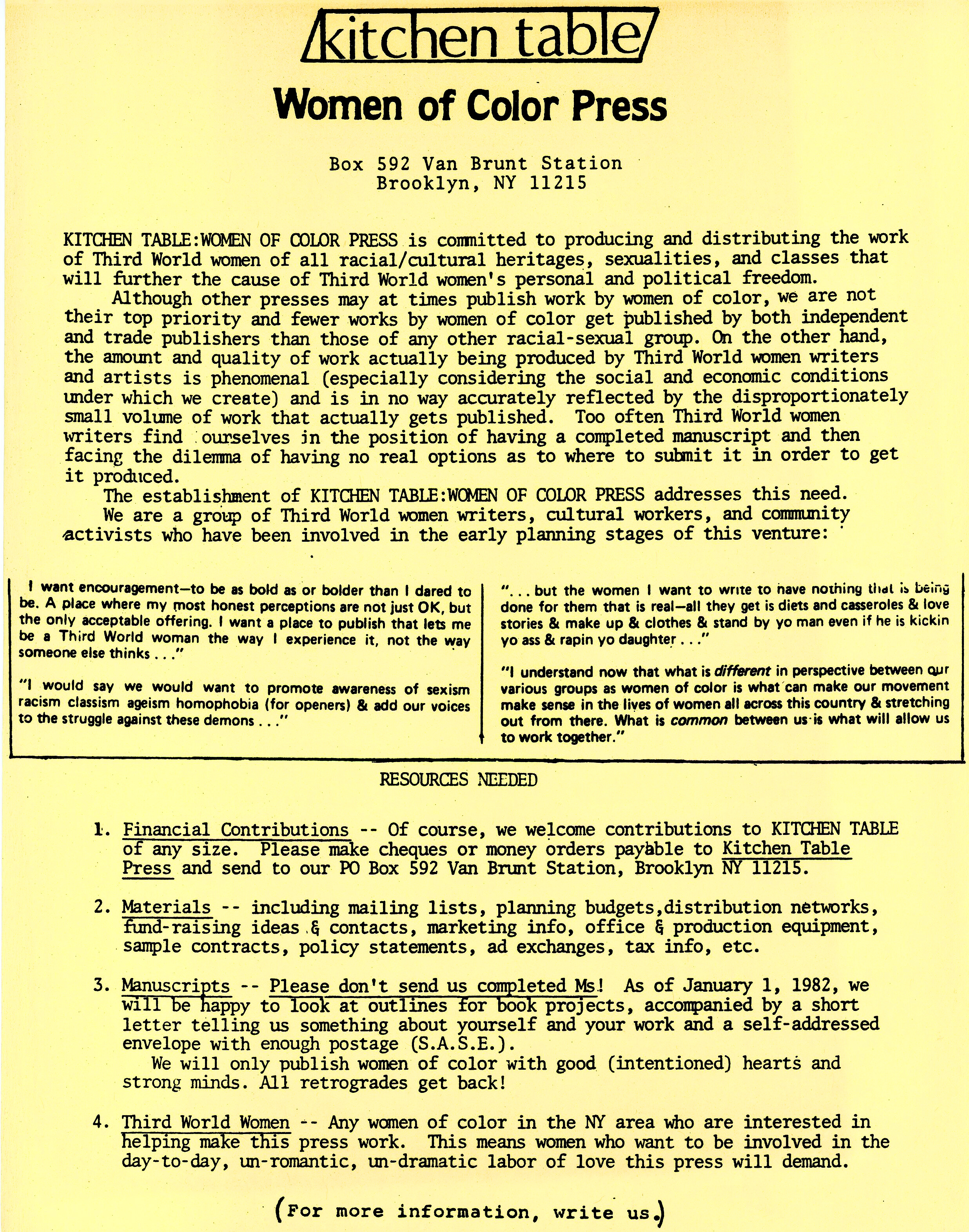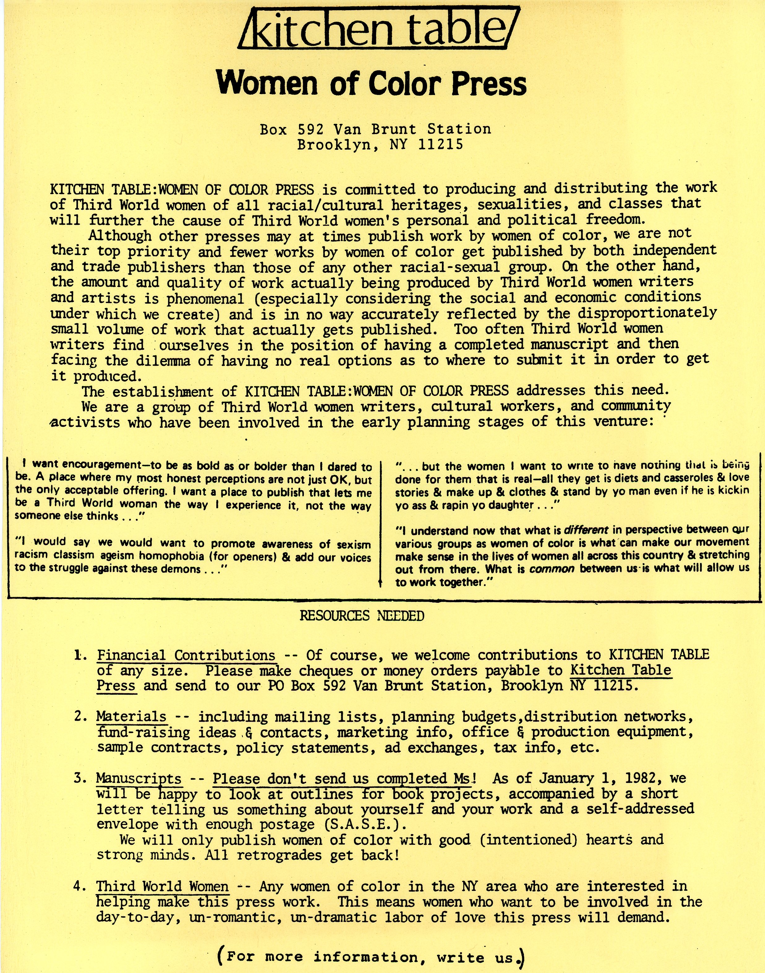 Books, essays, and papers published by women of color led the conversations of a more intersectional feminism. In 1981 the feminist anthology Bridge Called my Back: Writings by Radical Women of Color edited by Cherríe Moraga and Gloria E. Anzaldúa was published, as was Ain’t I a Woman by Bell Hooks. Kitchen Table Women of Color Press, run by Barbara Smith, Cherríe Moraga, and Audre Lorde, was in full operation publishing feminist and lesbian writers of color. In 1983 Kitty Tsui published The Words of a Woman On Fire, making her the first Chinese American lesbian to come out with a book, following Korean American Willyce Kim, who published Eating Artichokes in 1972.[1]Barbara Smith's book, Toward a Black Feminist Criticism (1977) begins with Smith saying: