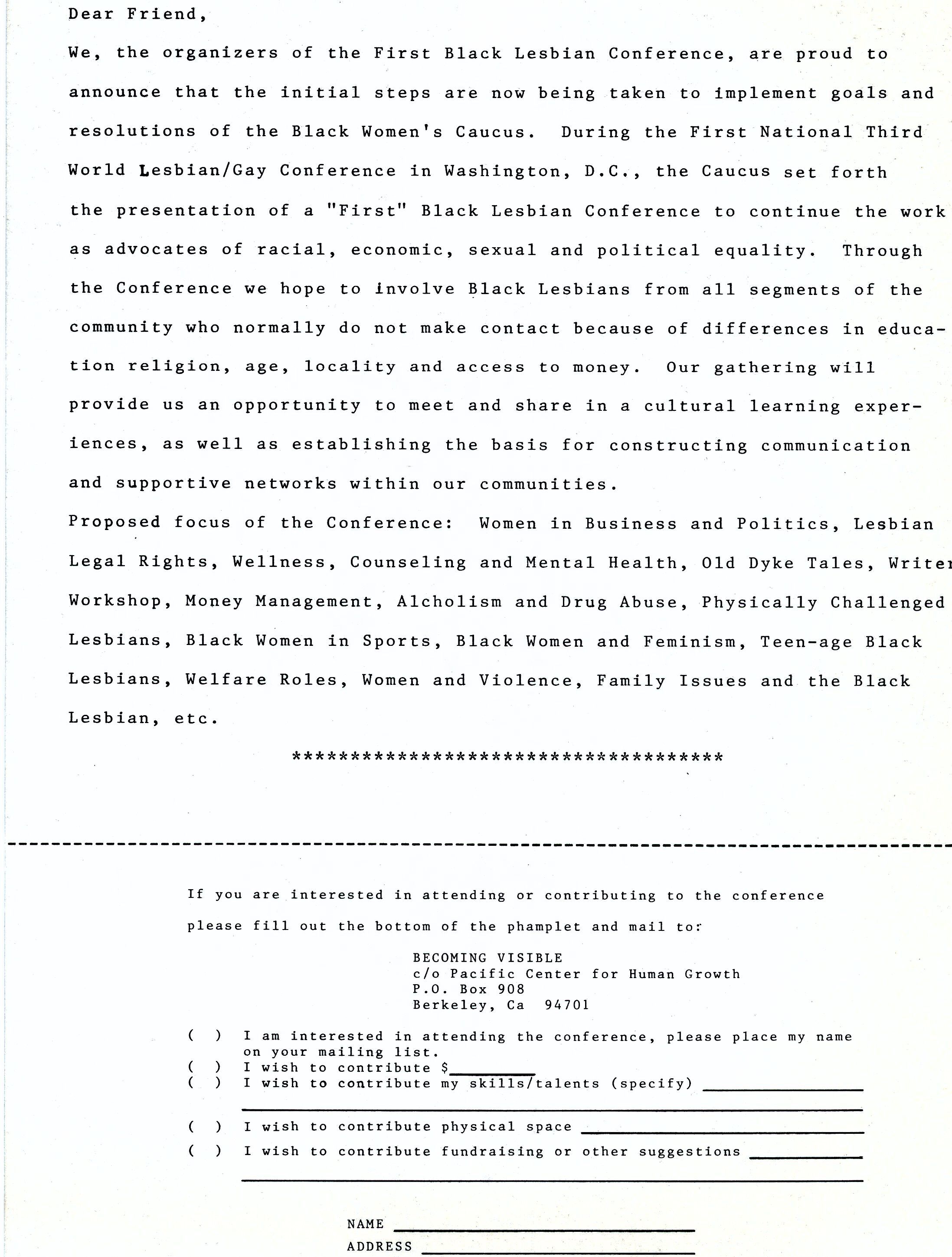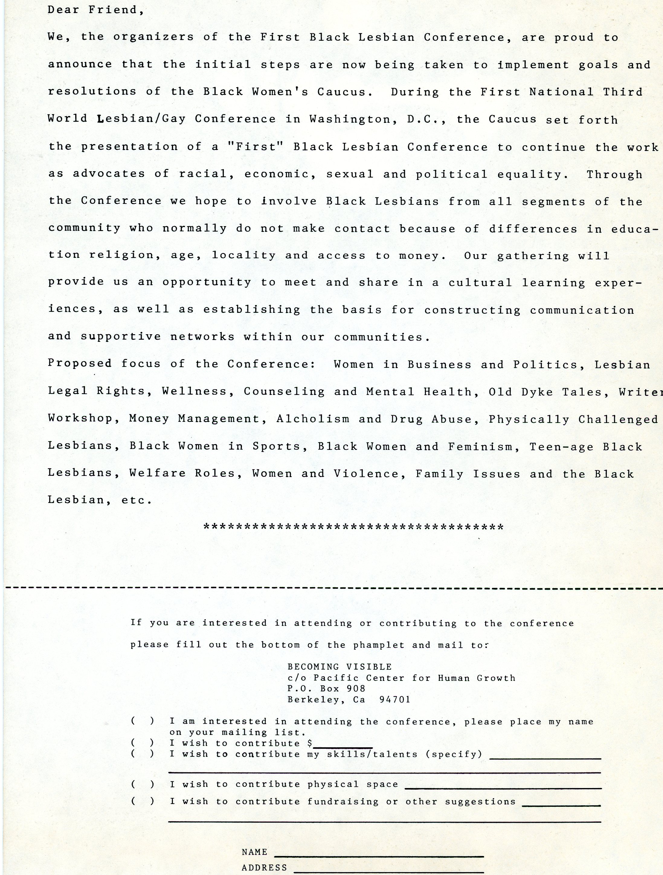 1 2024-03-08T17:59:26-08:00 Bonnie Morris/Julia Tanenbaum/Angela Brinskele ef6dc7f76d6383521c985b036594e440c4099a58 43632 2 Flyer for the First Black Lesbian Conference. 2024-03-08T18:27:28-08:00 Bonnie Morris/Julia Tanenbaum/Angela Brinskele ef6dc7f76d6383521c985b036594e440c4099a58This page has tags: