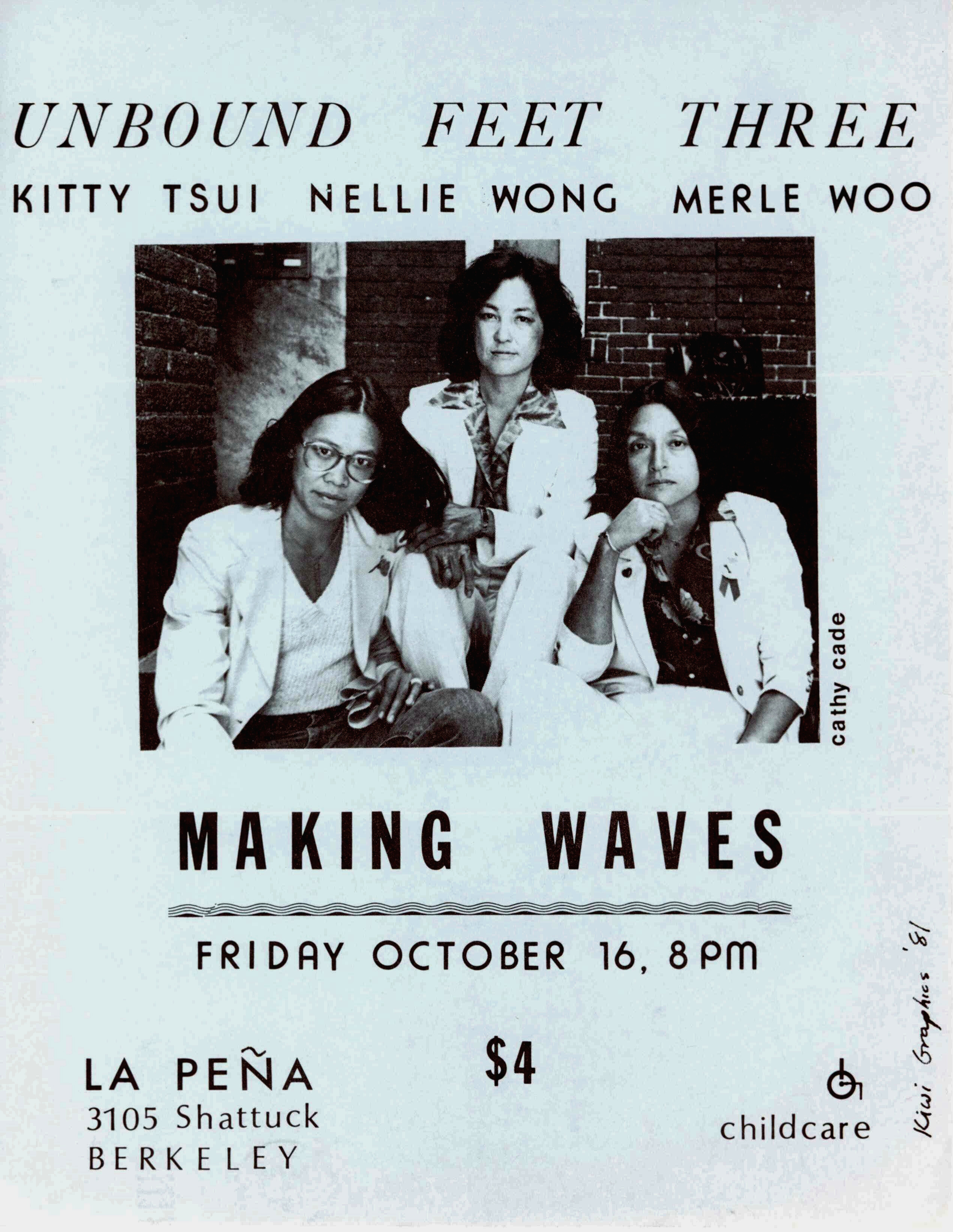 In the summer of 1979 in San Francisco, the collective of Asian American women writers and performers called Unbound Feet was formed by Kitty Tsui, Nellie Wong, Merle Woo, Nancy Hom, Genny Lim, and Canyon Sam. Canyon Sam and Kitty Tsui had previously met through the Asian American Feminists rap group, where their shared pursuits as writers, poets, dramatists, and feminists connected them.[7] The group was radical in their presence on stage, in a time when Asian American women were rarely seen as performers; after their first performance at the James Moore Oakland Museum Theater, the group was very successful, gathering crowds up to 600 people during their next two years performing.[8] Tsui, Sam, and Woo did not address lesbianism in their performances, but the show's program explicitly stated their sexuality, without shame, bringing visibility to lesbians in the Asian American community.[9]