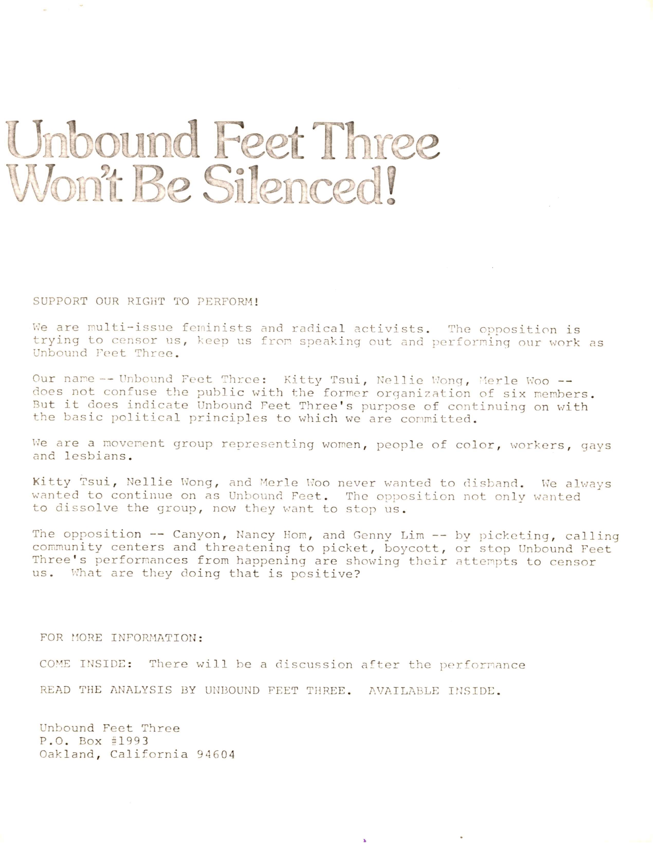 [7] Sueyoshi, "Breathing Fire," 11-17; Trinity Ann Ordona, “Coming Out Together: An Ethnohistory of the Asian and Pacific Islander Queer Women’s and Transgendered People’s Movement of San Francisco,” PhD diss., University of California, Santa Cruz, 2000, 128-132; "The Struggle of Unbound Feet," Subject Files, Drawer 05-03, June L. Mazer Lesbian Archives, Los Angeles, CA.