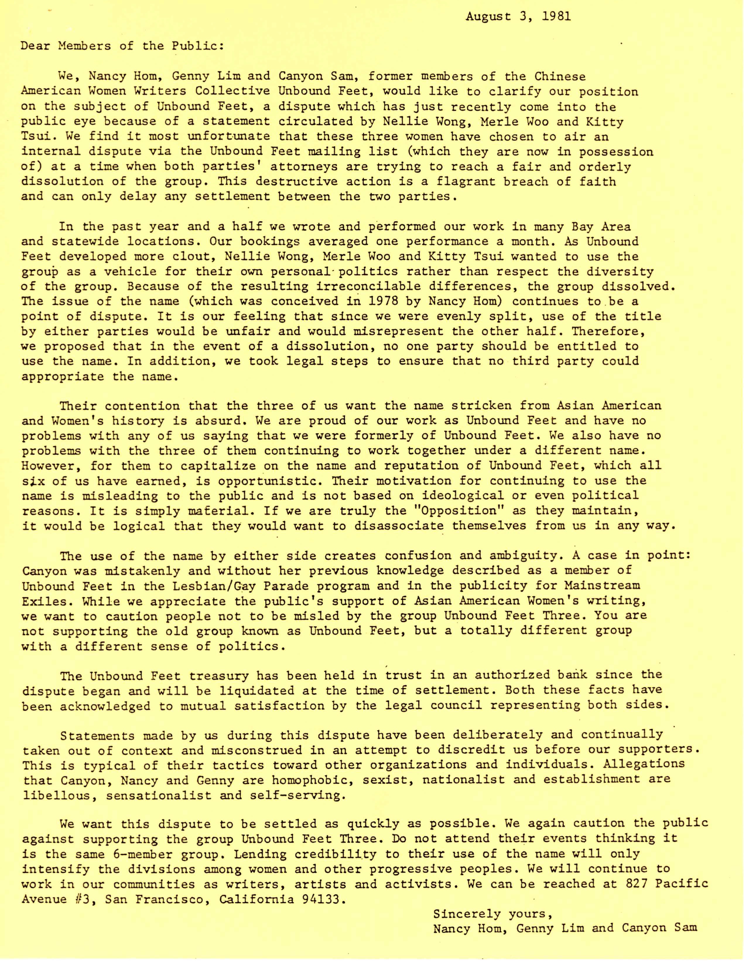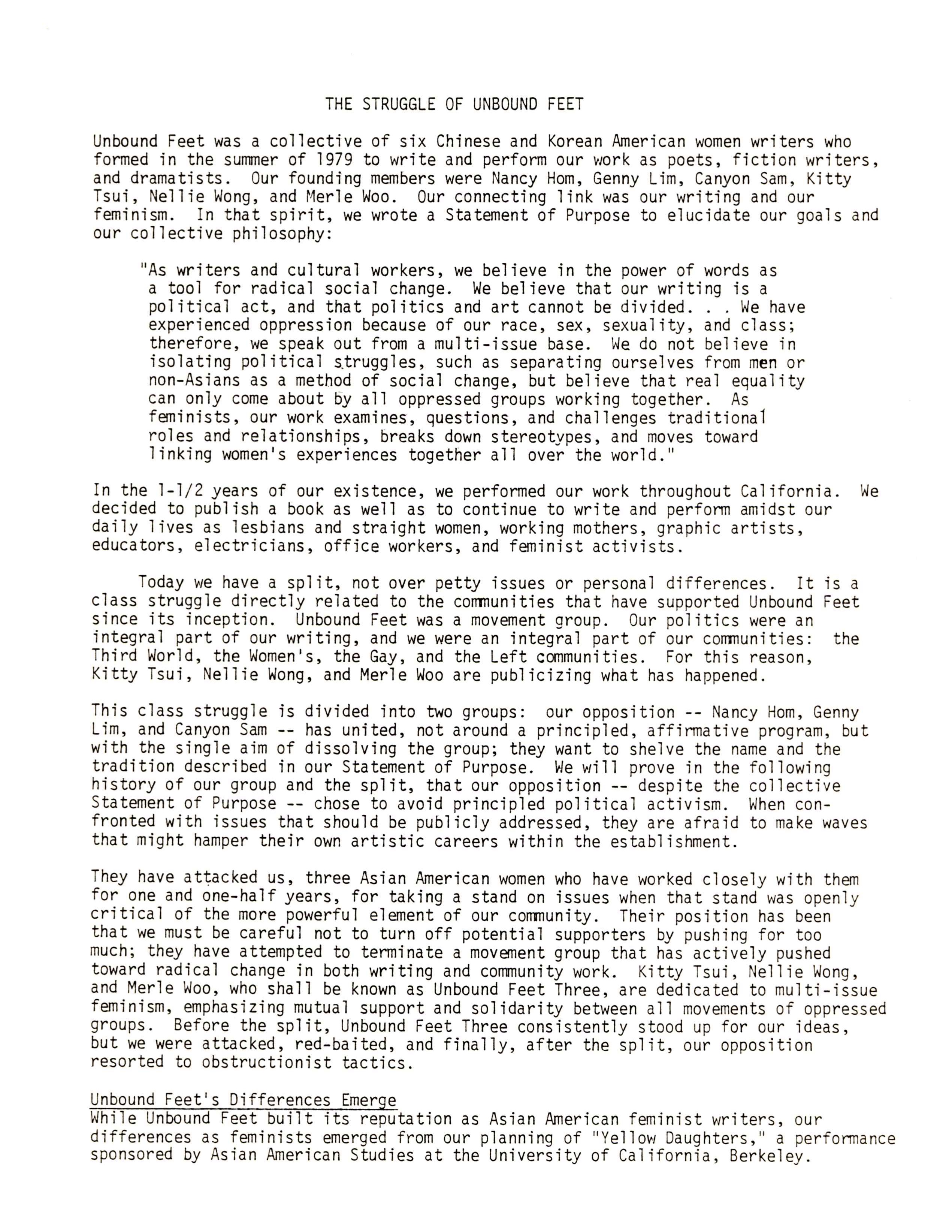 By 1981, the group disbanded and broke apart after a dispute concerning Merle Woo's fight with the University of California, Berkeley. Woo was terminated from her position as an Asian American Studies lecturer by the University over criticism of her department. She then charged them with discrimination for being a "lesbian, a socialist feminist, and trade unionist".[10] Woo was hoping to use the platform of the Unbound Feet to garner support for her case against the University, but the women were divided over whether to use the group as an outlet for workplace grievances that would put them in conflict with the Asian American Community; ultimately Woo, Tsui, and Wong went on to form the Unbound Feet Three in 1985, after the others went separate ways.[11]