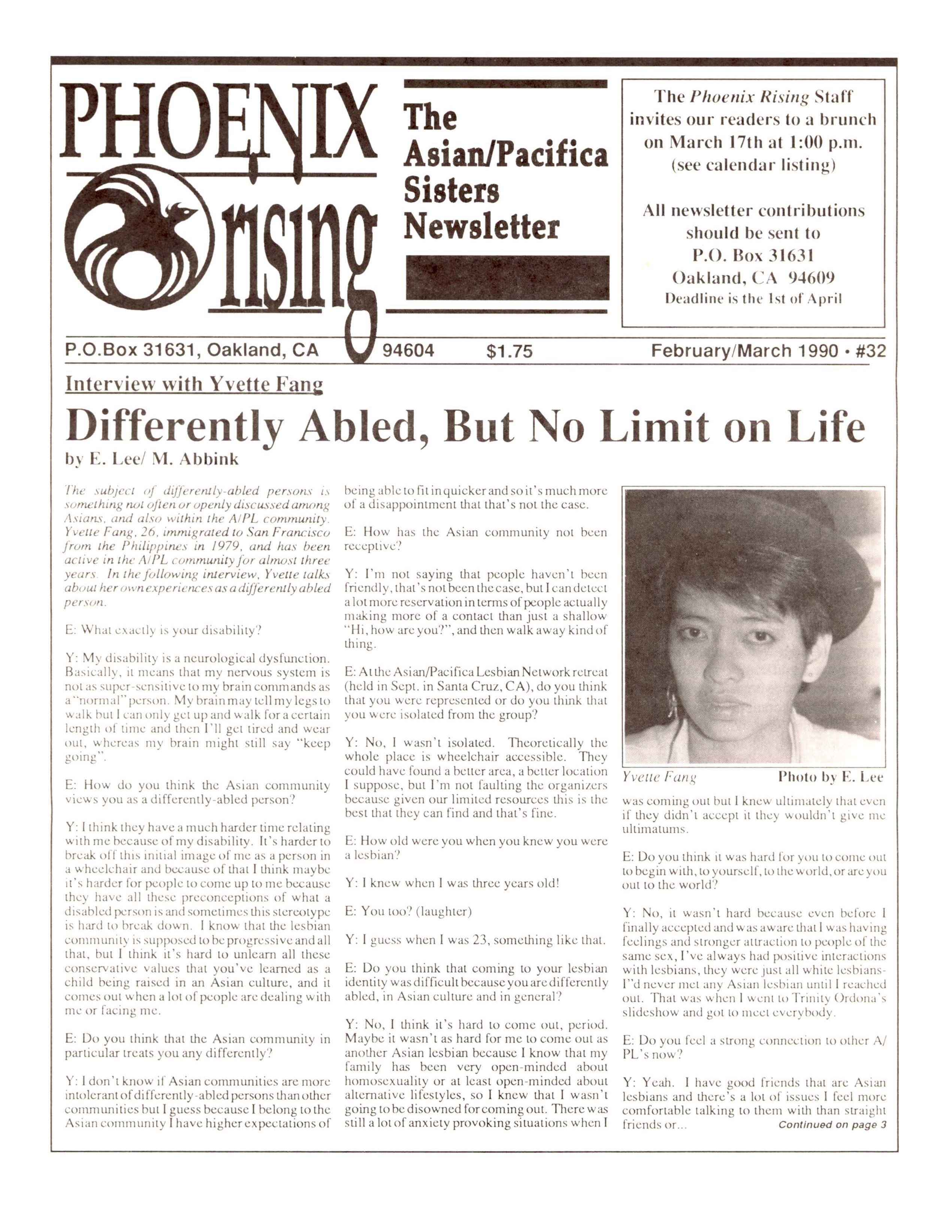 The momentum of the first National Third World Lesbian and Gay Conference also affected Asian American gays and lesbians, who began to join together in networks of support.[12] The Asian/Pacific Lesbians and Gays (A/PLG), now known as the Asian/Pacific Gays and Friends, was founded in 1981 by queer Asian activists, including Tak Yamamoto. Phoenix Rising newsletter provided a platform for Asian American lesbians and queer people in 1984. It was founded by Lori Lai, May Lee, Susan Lee, Pam Nishikawa, Gisele Pohan, Marie Shim, Doreena Wong, and Zee Wong.[13] The Asian/Pacifica Lesbian Sisters (A/PLS) was founded in 1988. The Asian Pacific Islander Queer Women Transgender Community (APIQWTC) was founded in 1987 by a few women and later run by activists Crystal Jang, Koko Lin, and Trinity Ordona. Asian American lesbians organized retreats like the 1987 West Coast Asian Pacific Lesbian Retreat and the 1989 "Coming Together, Moving Forward" the Asian/Pacific Lesbian Network (A/PLN) retreat.Zoe Nicholson and the Equal Rights Amendment