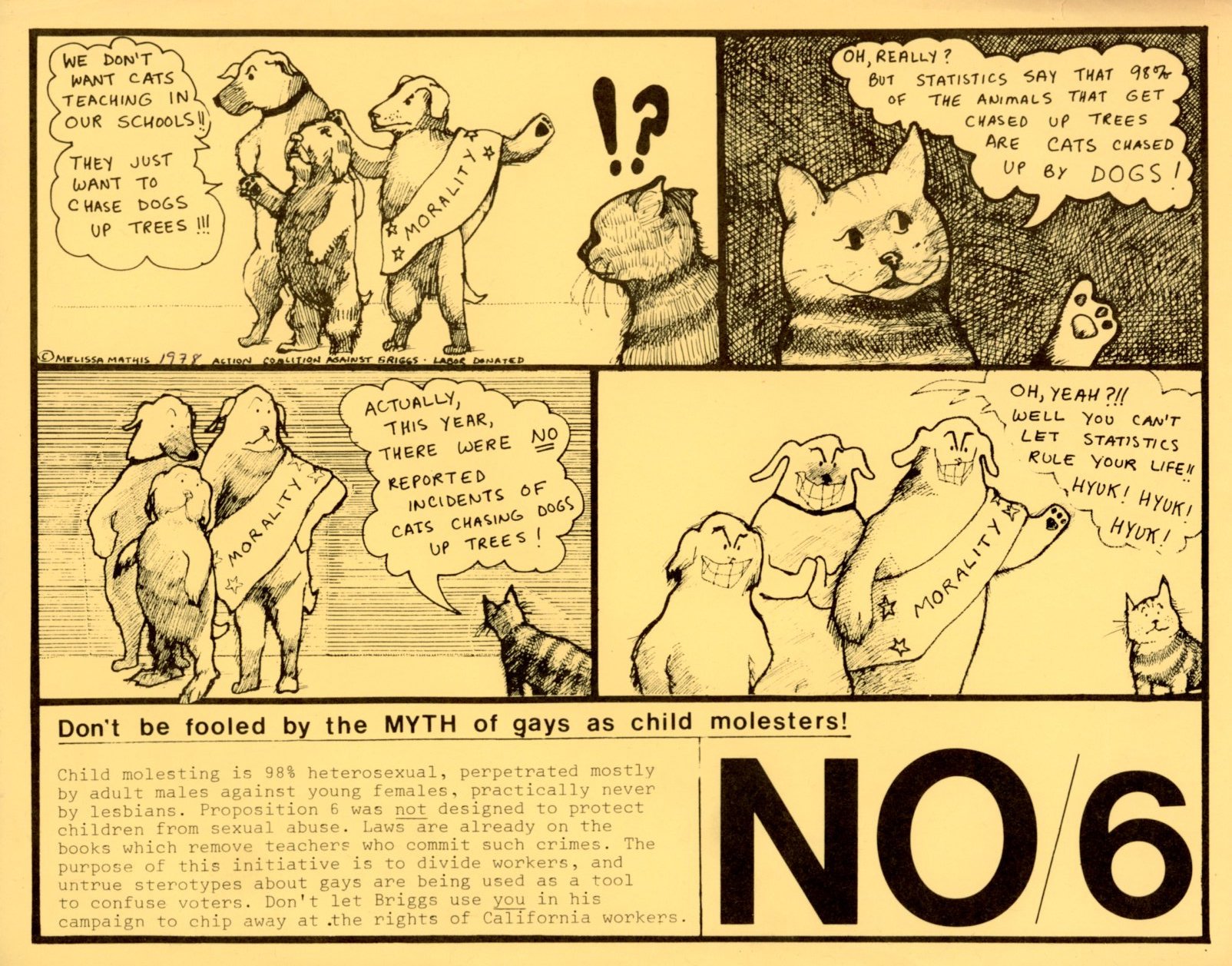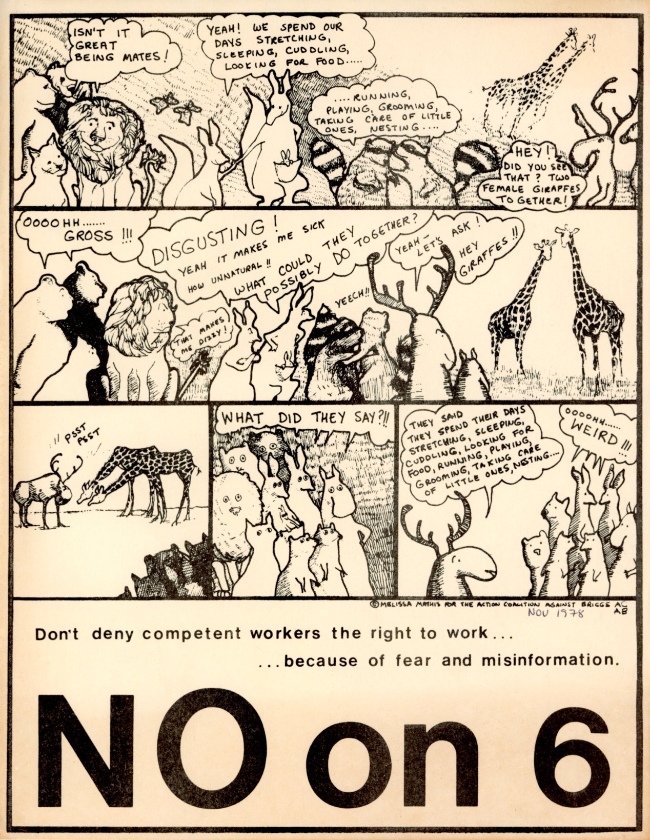 12023-11-13T17:21:28-08:00Bonnie Morris/Julia Tanenbaum/Angela Brinskeleef6dc7f76d6383521c985b036594e440c4099a58436321Cartoon with animals discussing their differences. Prop 6, also known as the Brigg's initiative would have barred LGBTQ people from teaching in public schools.2023-11-13T17:21:28-08:00Bonnie Morris/Julia Tanenbaum/Angela Brinskeleef6dc7f76d6383521c985b036594e440c4099a58