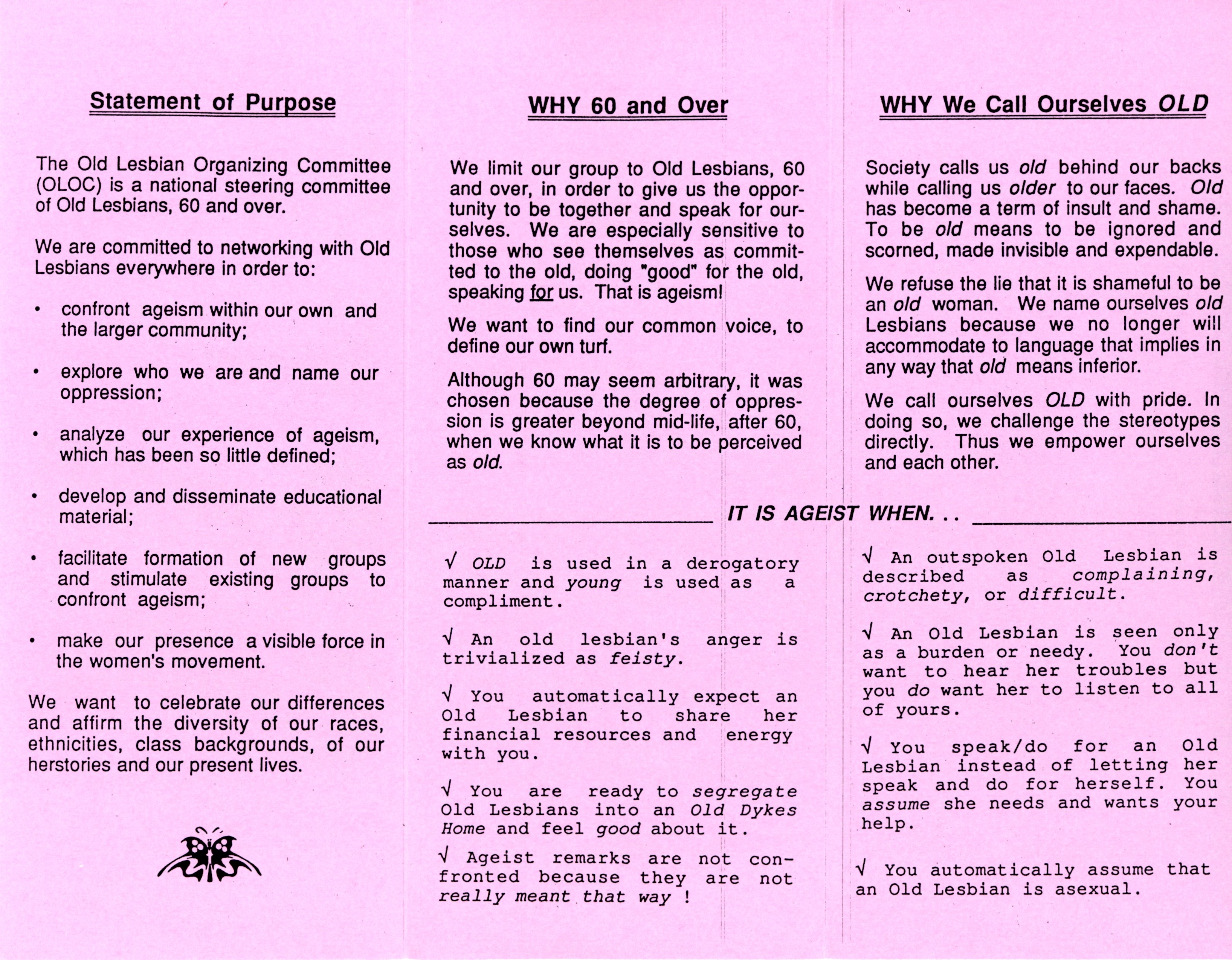 12023-11-14T19:20:50-08:00Bonnie Morris/Julia Tanenbaum/Angela Brinskeleef6dc7f76d6383521c985b036594e440c4099a58436323Pamphlet covers OLOC's statement of purpose and reason to fight ageism in society.2024-03-13T14:36:31-07:00Bonnie Morris/Julia Tanenbaum/Angela Brinskeleef6dc7f76d6383521c985b036594e440c4099a58