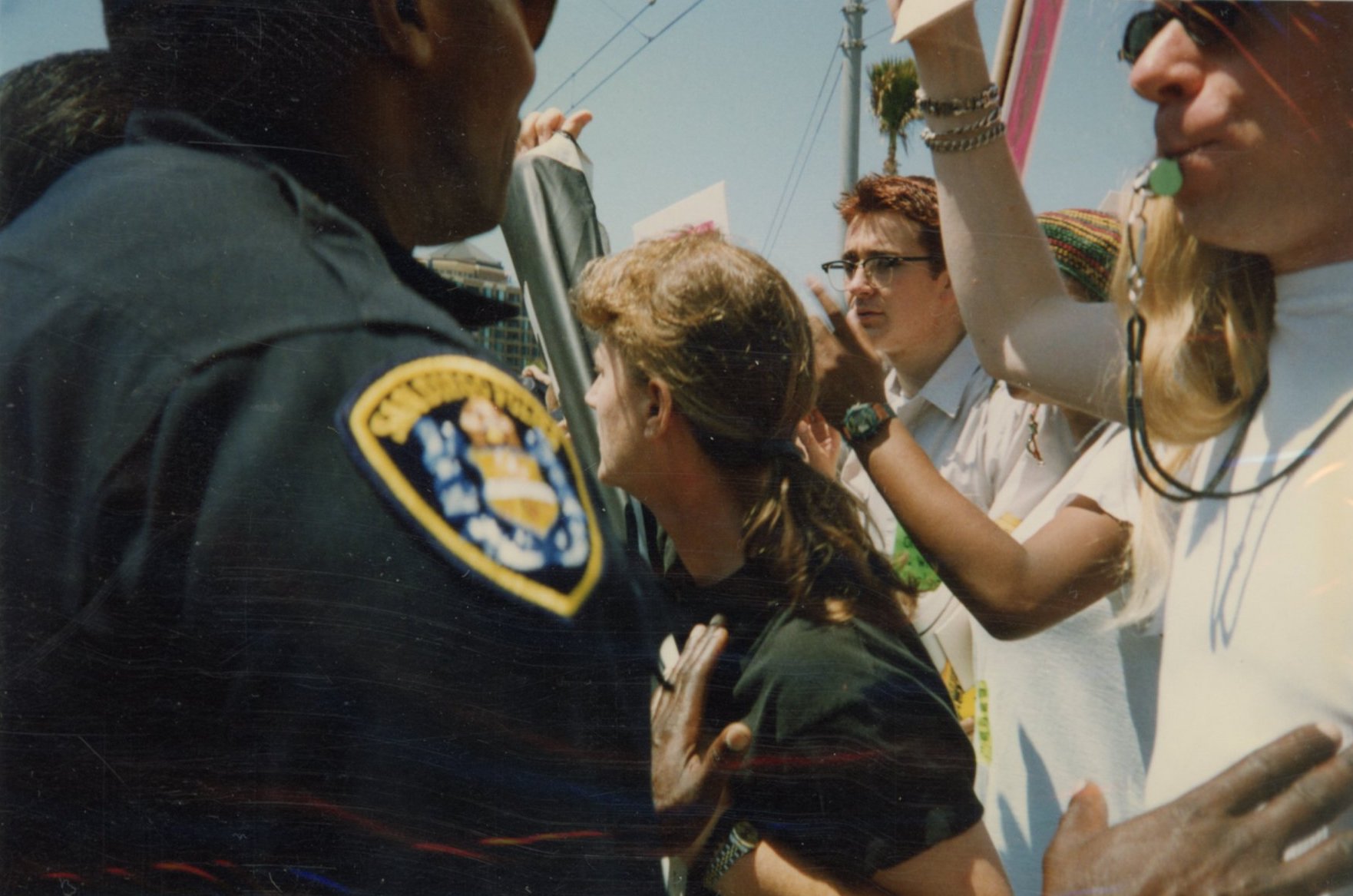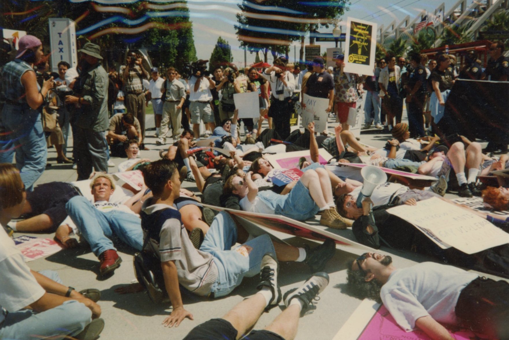 Die-ins were used by ACT UP activists to remind people of the bodies affected by HIV and AIDS when these deaths were largely being ignored by the media. It brought a physicality and gravity to these silent actions that grew out of a legacy of sit-ins, activists chaining themselves to buildings, and disrupting public and private infrastructure.[2] This die-in was held at San Diego Pride festival in 1996, and while it is not silent (one person holds a megaphone in the center right) it sends a message by disrupting space.