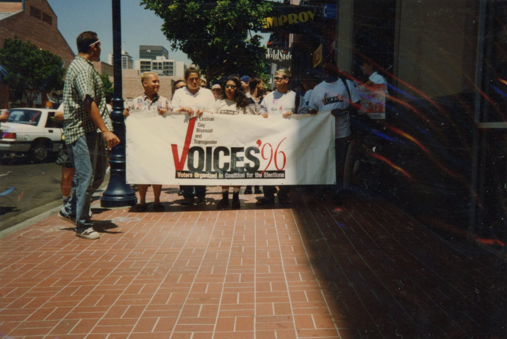 In 1996 the Pride festival in San Diego was held in late July and focused on protesting the Republican National Convention that would be held there in early August. Voters Organized In Coalition for the Elections (VOICES) held a voter registration drive and marched in the parade. San Diego Pride also launched a Rainbow Flag Campaign to show San Diego’s strong LGBTQ presence to RNC attendees. Protests were held to disrupt the convention in addition to the usual celebratory parade and festival.[1]