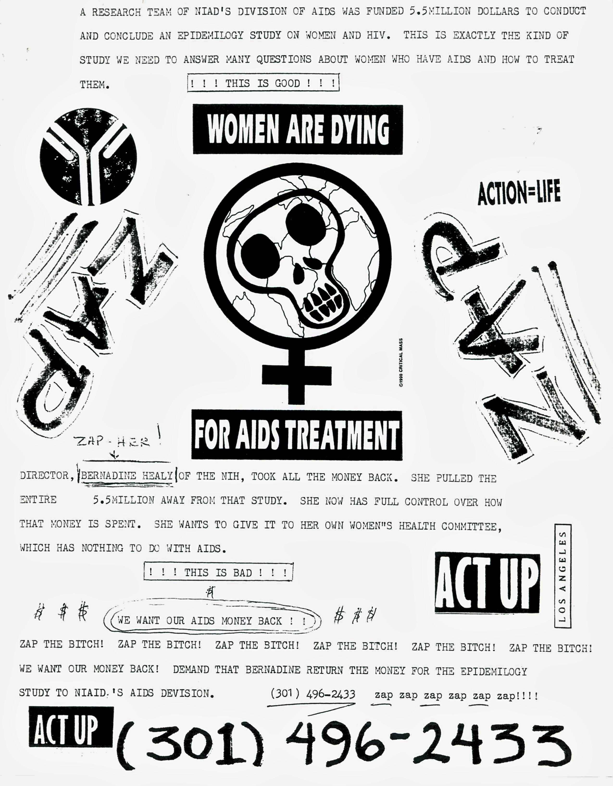 In 1990, Mary Lucey and Nancy MacNeil were among the original members of ACT UP/LA’s Women’s Caucus. The goal of the Caucus was to change the Center for Disease Control’s (CDC) definition of AIDS to represent symptoms and manifestations of the disease in women and intravenous drug users who were left out of early definitions of the disease and clinical trials, and to spread awareness of safer sex among women sleeping with women.