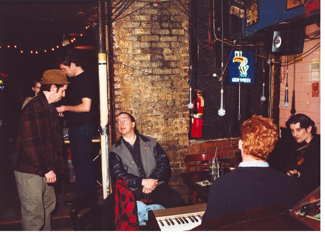 I first tried to record from a single stereo mike, but as the session table could only hold four or five musicians, the majority of players on busy nights would end up lost or drowned out. I finally settled on using one excellent stereo mike hung directly over the table, and four or five workhorse mikes hung in a circle on the periphery. In this way, the center mike could pick up the bulk of the session, and the outlying players could be reinforced by a remote mike if needed. All the cords ran across the ceiling and around the corner to a mixing board just out of sight. The session was mixed on the board by ear as it was played, and was recorded straight to CD. We knew that this recording method allowed no second chances in the studio, but we wanted a documentary-style sound and an album with total transparency, We knew that this method could easily result in the best tracks being missed through bad mixing, so we developed the backup method of recording two different mike mixes at the same time. Greg, Patrick and Eamon managed to select and work with these mixes to make the final tracks, somehow overcoming the limitations of the recording method while still sticking to the intended documentary aesthetic.