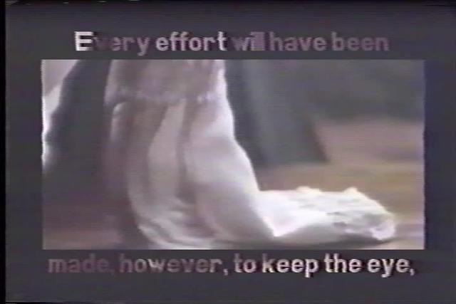 Similar to Aletheia and Kore, Operculum also uses the detournèment of sound and image to level a critique of dominant structures. In this case, the juxtaposition of sound recorded from consultations for cosmetic eyelid surgery with text passages about attempts to use lobotomy as a cure for schizophrenia exposes the brutality and sadism engrained within the “fashion-beauty complex”. The racist and sexist undertone of the Beverly Hills plastic surgeons are made all the more evident when heard over written descriptions of horrific practices such as frontal lobotomies performed with an ice pick that is inserted through the patient’s eye socket. Yet, Operculum is not an overt condemnation of cosmetic eyelid surgery. It is interesting to note that Tran’s use of detournèment here is different from its common usage as satire and agit prop in many contemporary experimental videos. The use of detournèment in Operculum is not explicitly political. Instead, Tran seems more interested in creating a de-stabilizing effect by combining unlikely source material, and then using this de-stabilization to suggest new or expanded meanings for these images and sounds. In taking detournèment away from agit prop, Tran allows more room in her usage for multiple meanings and ambiguities to emerge. While the juxtapositions in Operculum remain critical in relationship to the source material, their interpretation is very much left to the viewers and their reading of the ensemble. Much of the appropriated dialogue and music in the earlier videos of the Blindness Series are used in this manner, which recalls Debord’s description of a “parodic-serious stage” in detournèment, where “the accumulation of detourned elements, far from aiming at arousing indignation or laughter by alluding to some original work, will express our indifference towards a meaningless and forgotten original, and concern itself with rendering a certain sublimity.” In the Blindness Series, there is too much care in the selection and juxtaposition of the original to qualify Tran’s engagement as indifferent. Therefore, the sublimity that she strives to render here could be more aptly described as the critical sublime.