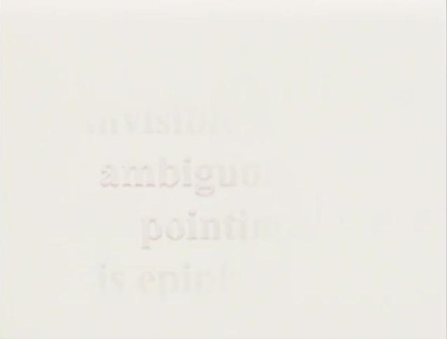 Lines of text float against a milky white background, the words hovering just beyond perception and remaining images of text rather than words to be read. The images in turn embody a handful of ideas – about language, metaphor, communication and the ability or inability to see – all of which constitute the 10-minute video by Tran T. Kim-Trang called Alexia (2000), a term that designates “word blindness,” a condition that afflicts stroke victims and prevents them from perceiving individual letters. Rather than explaining the condition, Alexia instead enacts it visually, aurally, textually and discursively. The video becomes in all its formal attributes a means for exploring a nexus of ideas without culminating in a polemic or concise conclusion.