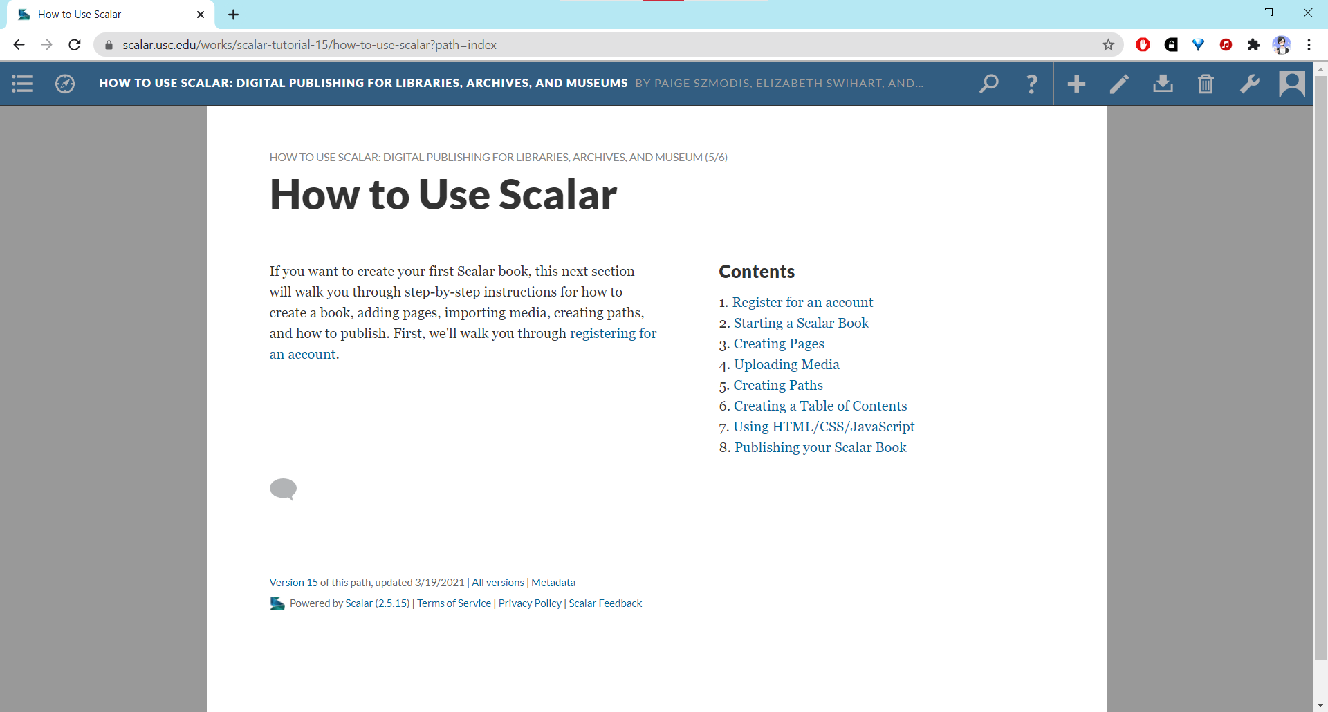 How to Use Scalar: Digital Publishing for Libraries, Archives, and MuseumsMain MenuAbout This ProjectAbout the creators and purpose of this projectWhat Is Scalar?A brief introduction to what Scalar can do as a platform.Scalar in Libraries, Archives, and MuseumsWhy Scalar is a relevant tool for librarians and other information professionals to learn.How to Use ScalarStep-by-step instructions for creating your first Scalar book.More ResourcesAnnotated list of resources with more information on using SclarPaige Szmodisc78c538ae17b32016e9167236f1aa8c213efc288Elizabeth Swihart2a47b61d624c2ba01890fc87ecc1d0c25d5107a3Shenwei Chang5f647018e81e72f2978f28d4dfbea5d53d6dd876