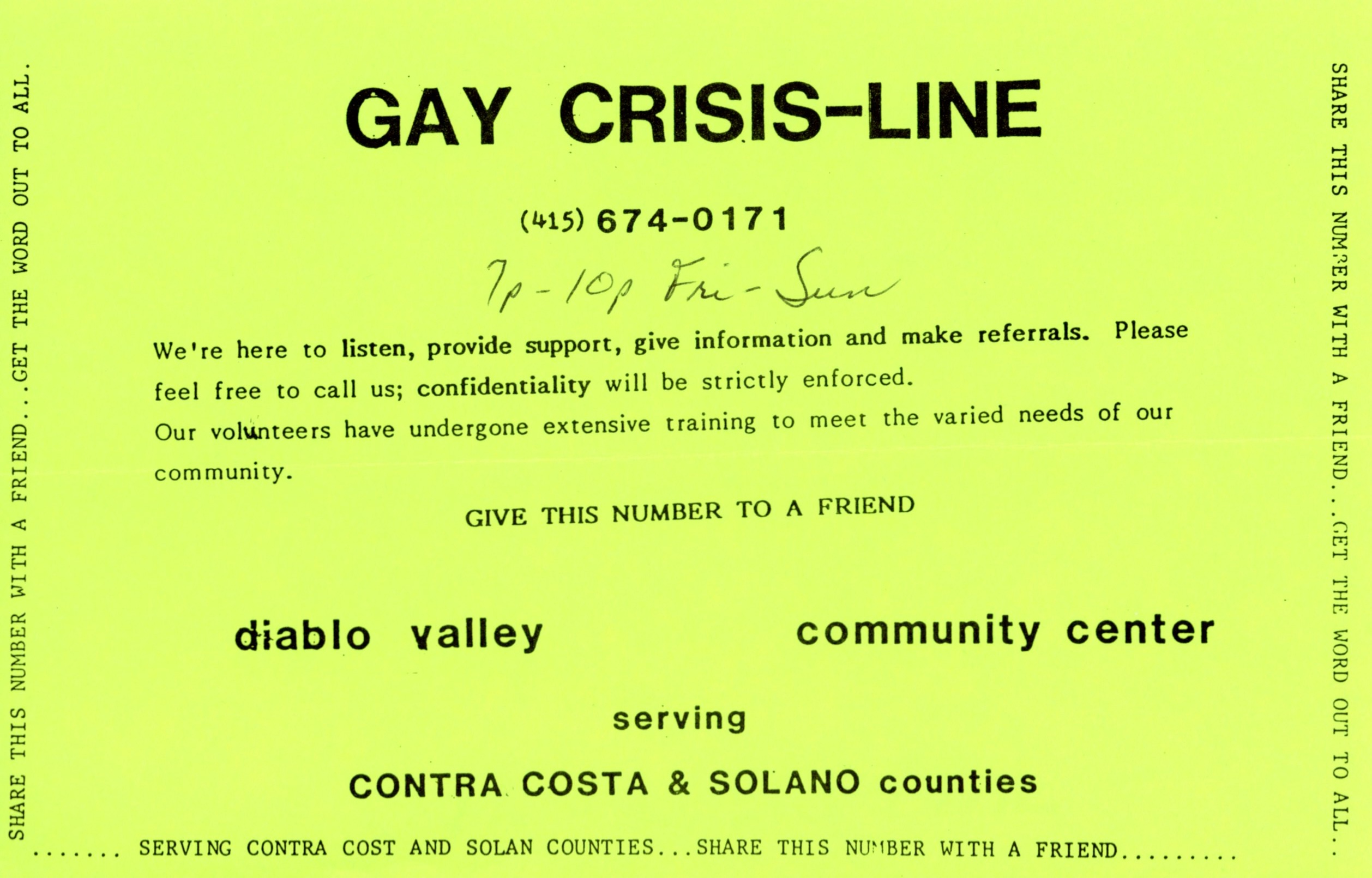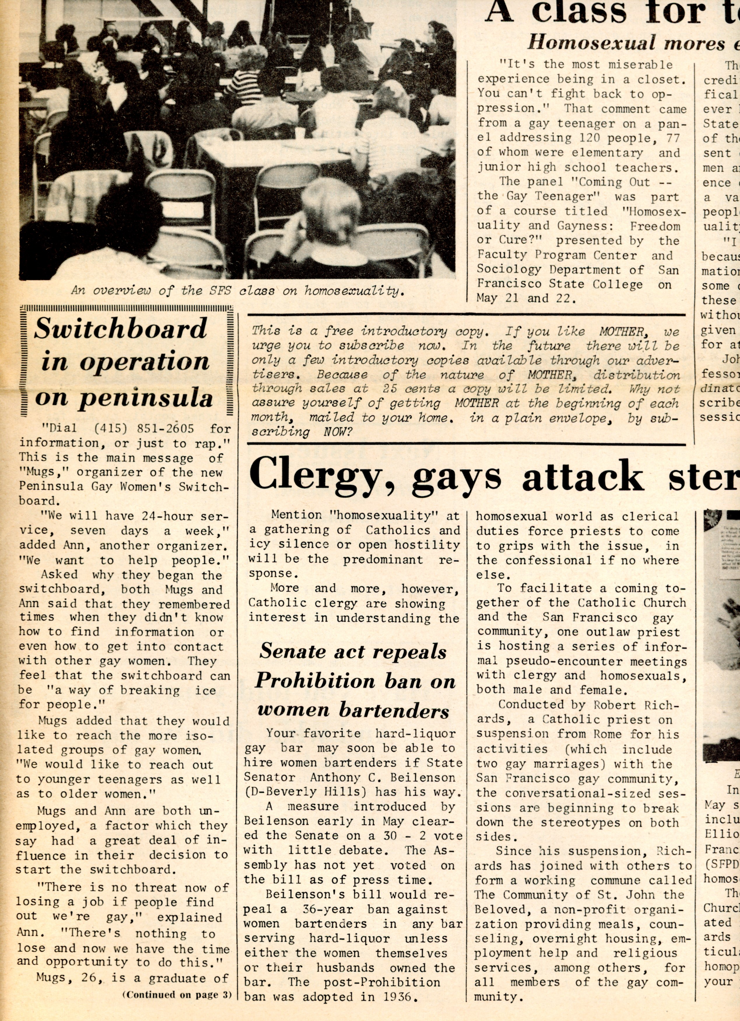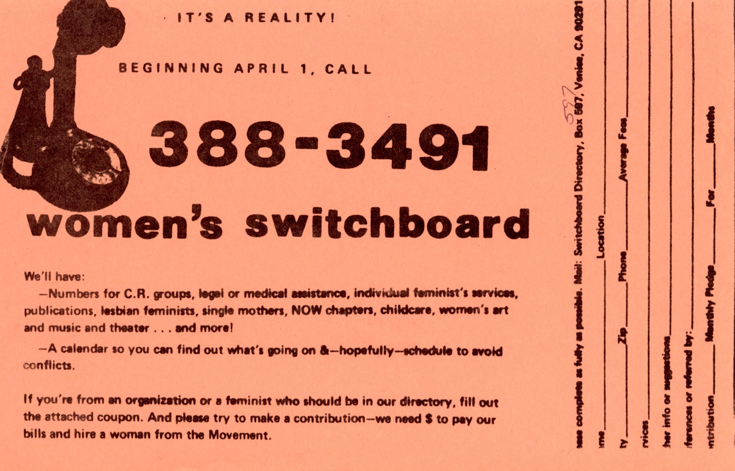 Communication networks for queer people before the Internet often took the form of switchboards, which functioned as information call centers and helplines pointing people to resources. The largest Gay and Lesbian Switchboards were in New York City and London. In New York, the Gay and Lesbian Switchboards operated separately from 1971 to the mid-1980s, when the Lesbian Switchboard, operated out of the Women’s Liberation Center, and the Gay Switchboard, operated by members of the Gay Activists Alliance, Beyond, and the Gay Liberation Front out of the Liberation House Gay Collective, merged into one at the New York LGBT Center.[1] The helpline still functions today, with the same phone number, through the LGBT National Help Center with the same number.In California, switchboards for lesbians and gays, or just women, were started but folded after only a few years. There seemed to be many of them, operating locally between San Francisco and the Bay Area, down to Los Angeles. The San Francisco's Women’s Switchboard operated from 1972 to the early 1980s, first operating out of the San Francisco Women’s Center, and then the San Francisco Women’s Building.[2] The Peninsula Gay Women’s Switchboard operated out of Redwood City, CA and had the hopes of unifying “all bay area switchboards,” as told in Mother magazine in 1985. In LA there are ads for a Lesbian Switchboard operating out of the Westside Women’s Center, the Women’s Switchboard with a home base in Venice, and various help and crisis lines.