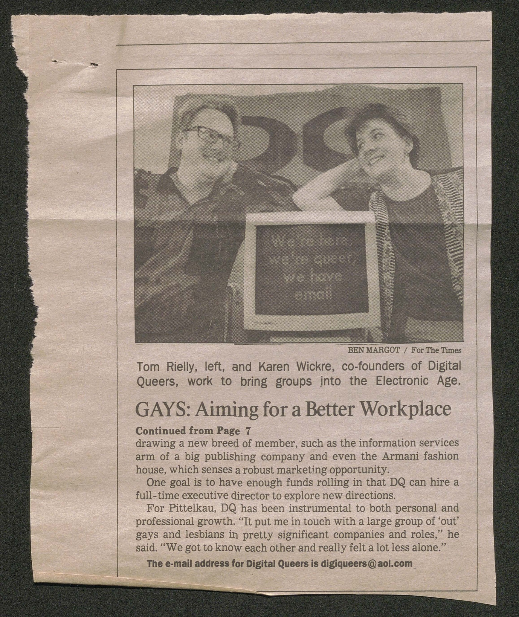 Some of these social networks also manifested as advocate groups for LGBTQ people. Digital Queers was a group that helped raise money, distribute technology, and educate queer people in the "electronic age." The group's goals involved providing support through online networking and activism to encourage LGBTQ people to come out at work, and in turn ensure those workplaces have policies that support LGBTQ people, like providing domestic partner benefits. The group frequently worked with the Human Rights Campaign Fun, The National Gay and Lesbian Taskforce, the Gay and Lesbian Alliance Against Defamation, and the Victory Fund, also receiving donations from Apple, Pacific Bell, and Microsoft.