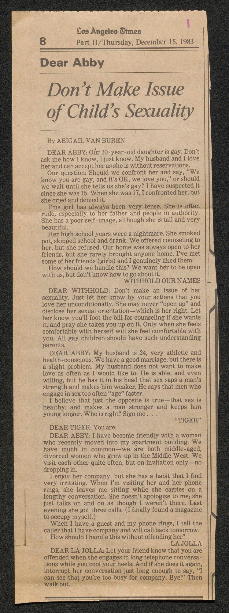 12024-04-01T16:06:07-07:00Bonnie Morris/Julia Tanenbaum/Angela Brinskeleef6dc7f76d6383521c985b036594e440c4099a58Don't Make Issue of Child's Sexuality2December 1983 issue of the Los Angeles Times with a Dear Abby advice column.The writer, WITHHOLD OUR NAMES, asked ABBY for advice on whether or not they should confront their daughter about her sexuality.2024-04-01T16:18:07-07:00Bonnie Morris/Julia Tanenbaum/Angela Brinskeleef6dc7f76d6383521c985b036594e440c4099a58