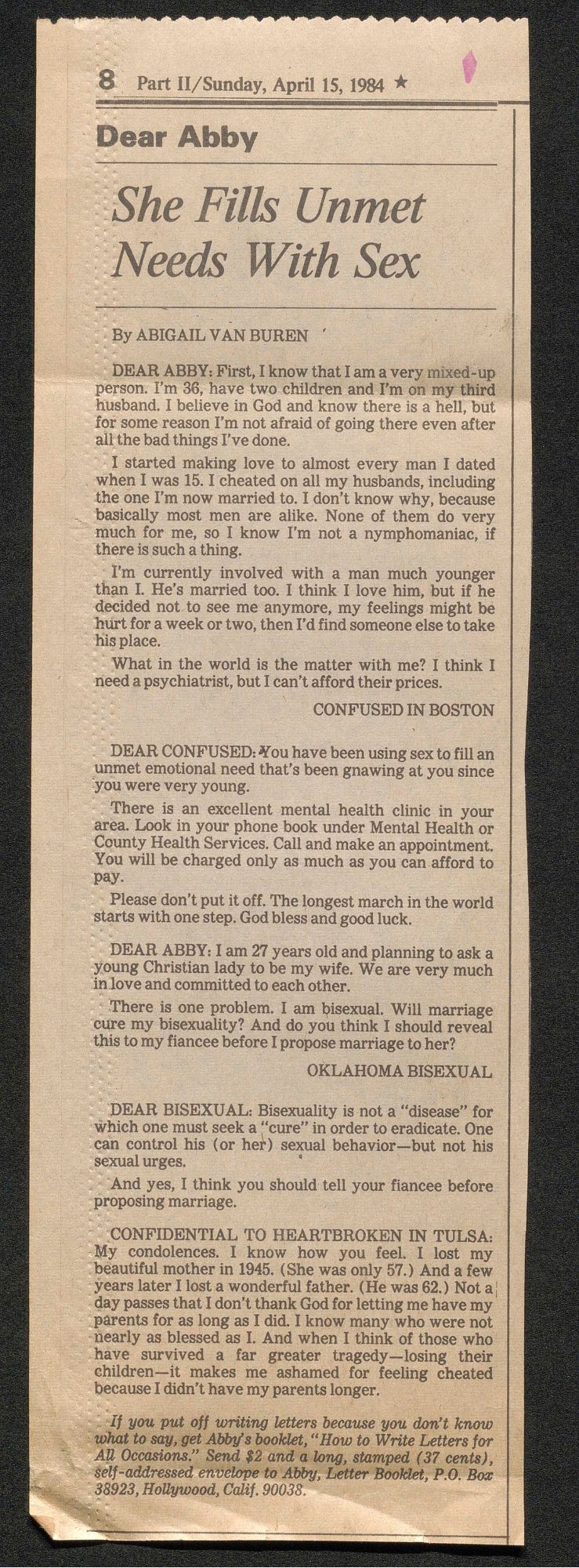 12024-04-01T16:06:07-07:00Bonnie Morris/Julia Tanenbaum/Angela Brinskeleef6dc7f76d6383521c985b036594e440c4099a58She Fills Unmet Needs with Sex2A newspaper clipping with a Dear Abby advice column. The writer, OKLAHOMA BISEXUAL, asked ABBY for advice on being being bisexual and getting married.2024-04-01T16:18:07-07:00Bonnie Morris/Julia Tanenbaum/Angela Brinskeleef6dc7f76d6383521c985b036594e440c4099a58