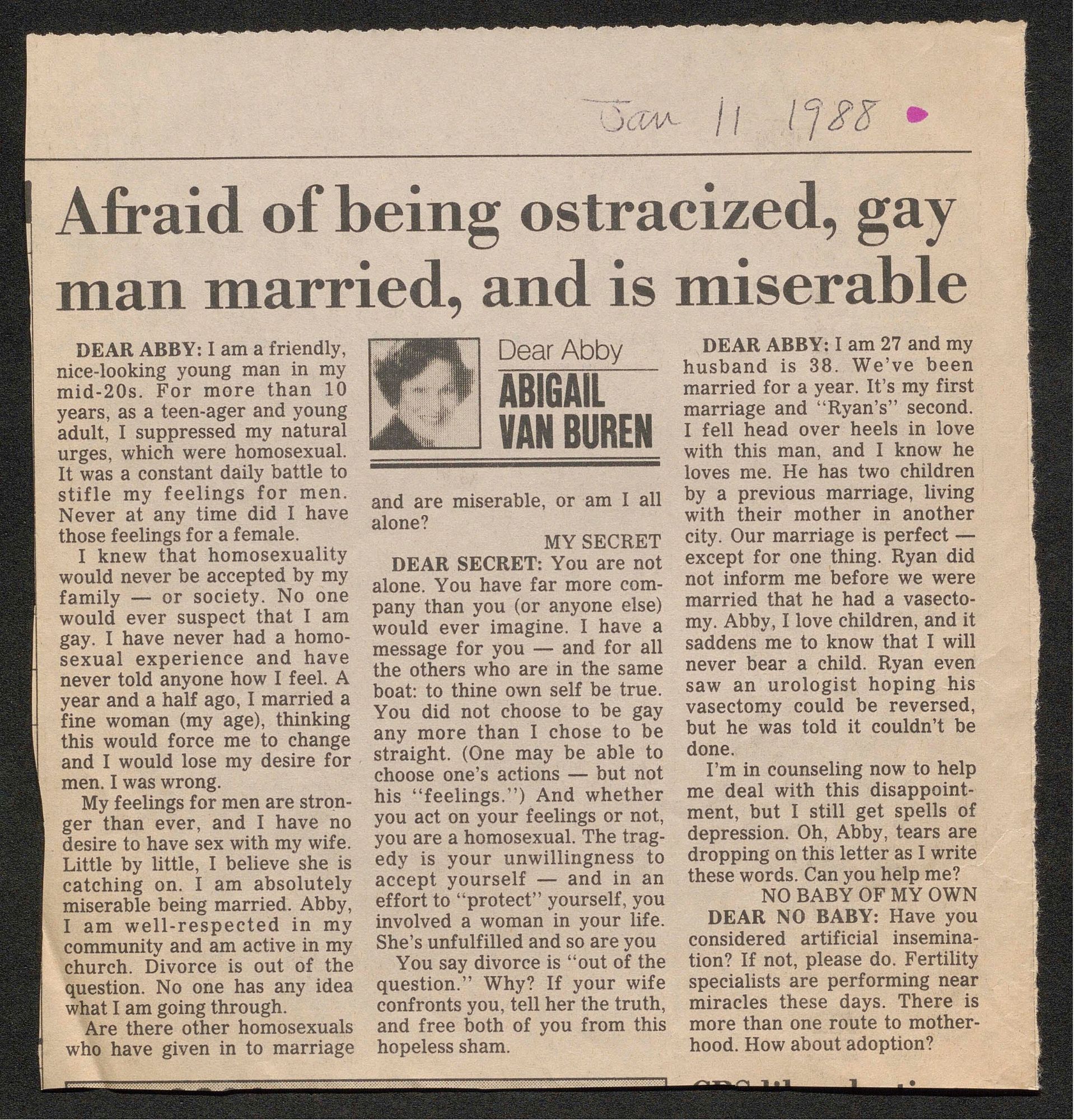 12024-04-01T16:06:07-07:00Bonnie Morris/Julia Tanenbaum/Angela Brinskeleef6dc7f76d6383521c985b036594e440c4099a58Afraid of being ostracized, gay man married, and miserable2January 1988 issue with a Dear Abby advice column. The writer, MY SECRET, asked ABBY for advice on being gay and miserable in a heterosexual, married relationship.2024-04-01T16:18:07-07:00Bonnie Morris/Julia Tanenbaum/Angela Brinskeleef6dc7f76d6383521c985b036594e440c4099a58