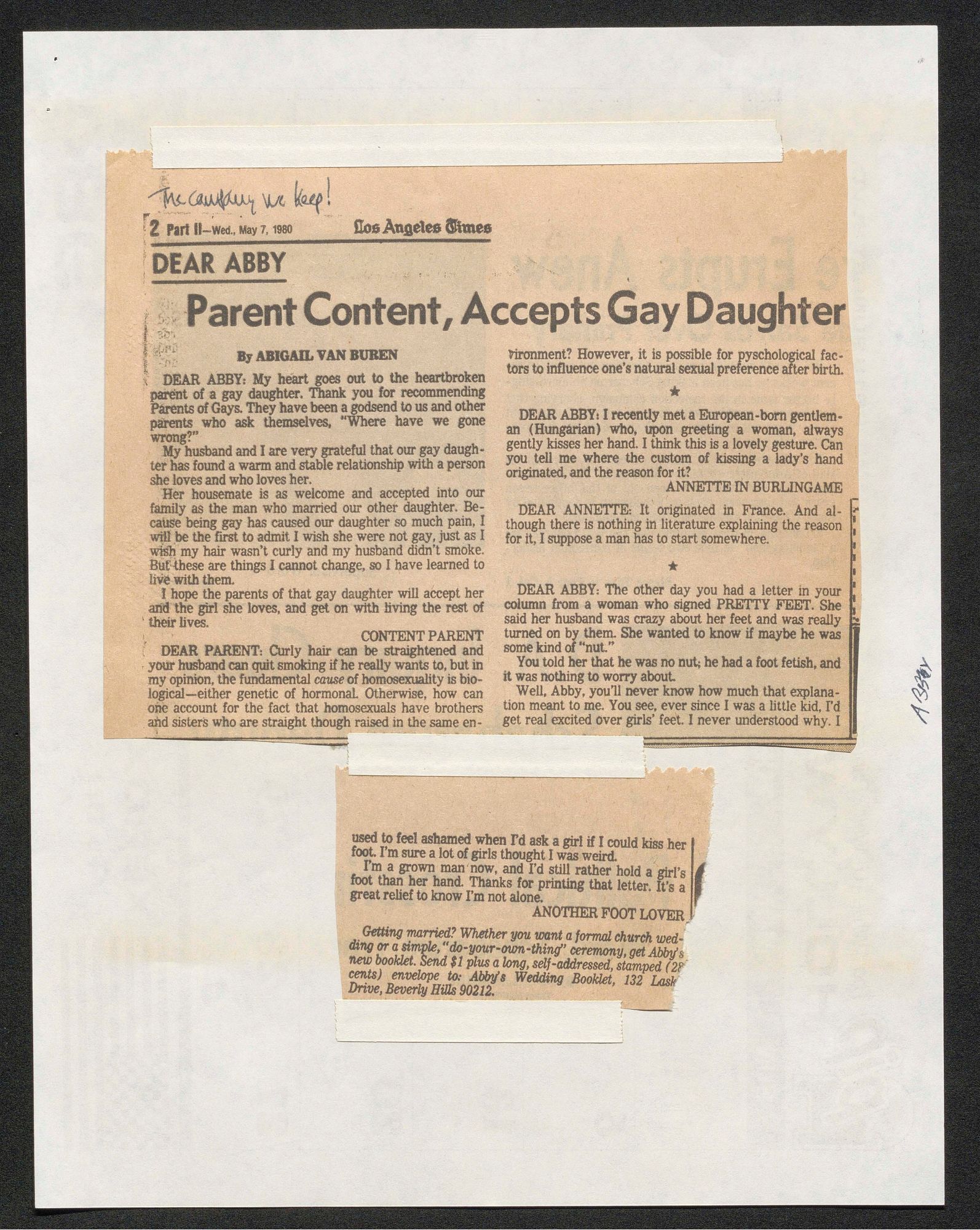 12024-04-01T16:06:07-07:00Bonnie Morris/Julia Tanenbaum/Angela Brinskeleef6dc7f76d6383521c985b036594e440c4099a58Parent Content, Accepts Gay Daughter2May 1980 issue of the Los Angeles Times with a Dear Abby advice column. Abby responds to the writer, CONTENT PARENT, who did not like that their daughter was gay but accepted it.2024-04-01T16:18:07-07:00Bonnie Morris/Julia Tanenbaum/Angela Brinskeleef6dc7f76d6383521c985b036594e440c4099a58