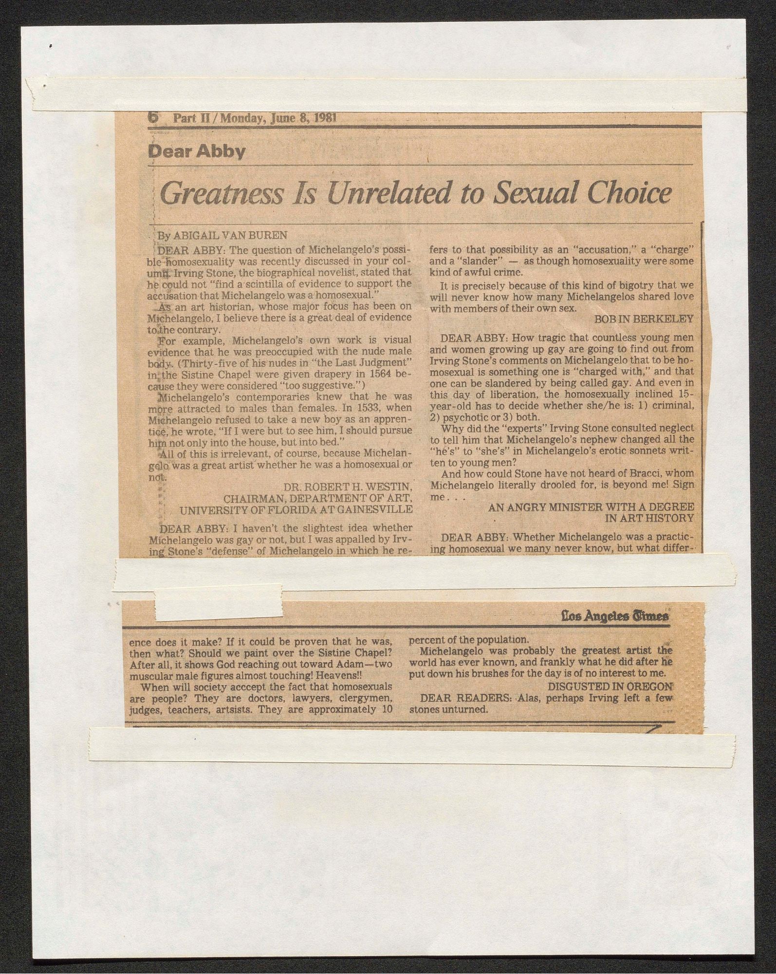 12024-04-01T16:06:07-07:00Bonnie Morris/Julia Tanenbaum/Angela Brinskeleef6dc7f76d6383521c985b036594e440c4099a58Greatness Is Unrelated to Sexual Choice2June 1981 issue of the Los Angeles Times with a Dear Abby advice column. Several writers express their opinions on a public figures derogatory statement about the possibility of Michelangelo being gay.2024-04-01T16:18:07-07:00Bonnie Morris/Julia Tanenbaum/Angela Brinskeleef6dc7f76d6383521c985b036594e440c4099a58