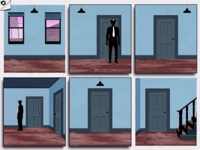 The player quickly learns that they can predict the path of the main character through each panel as long as they know which entrance he or she will use. If the character enters from the left, they’ll keep moving to the right. If they reach a flight of stairs, they’ll climb the stairs. And when they get to an exit, they’ll always take it. These rules set up the core spatial and temporal logic of the game—logic that trumps all other continuity.