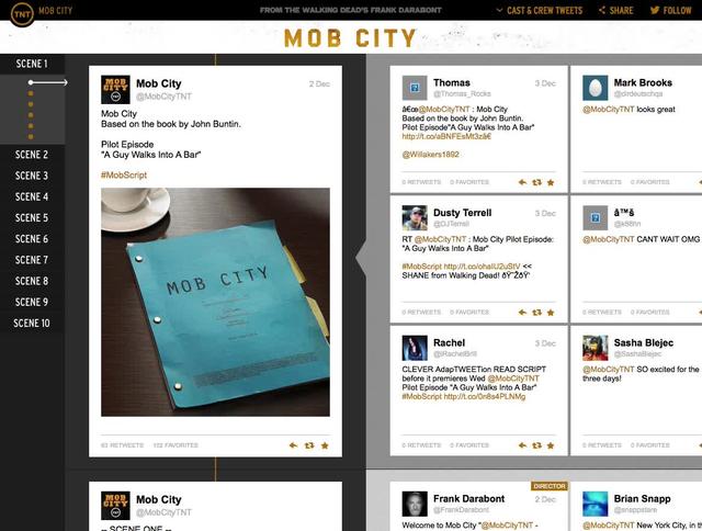 You can see here the first scene of the Mob City script, reformatted as a new digital comic that combines the images and looped Vine videos, with the text of the tweets appearing as captions.